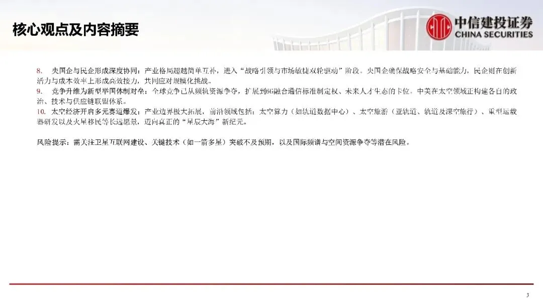 前竞争已从单一技术突破,升维至可复用火箭工程化、卫星制造工业化、星地融合商业化的全面竞赛。产业链在国央企与民营企业的高效协同下,正加速抢占频轨资源、争夺6G时代空天地一体标准话语权。未来,产业边界向太空算力、旅游等多元赛道拓展,标志着商业航天正从国家工程全面转向驱动未来经济增长与战略竞争的关键生态。