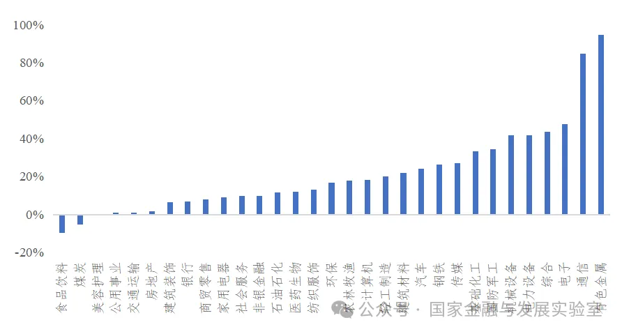 有色金属年度上涨幅度达到94%,通信行业指数上涨85%,电子行业指数上涨48%。