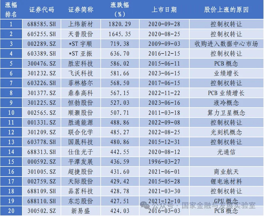 上市公司的并购重组成为市场资金追逐的热点,尤其是控制权转让类公司的股票位列涨幅榜前列。在涨幅前20的股票中,有7只属于控制权转让,这些股票的上市时间集中在2020年至2023年,正是注册制改革快速推进的阶段,这四年里新增上市公司近2000家,上市门槛较低,通过控制权转让是套现的最佳选择。另外,这些公司有共同的特点,经营业绩较差,上市公司之后一直徘徊在亏损的边缘。从控制权转让市场的需求方看,大多数属于“新质生产力”行业,涨幅最大的“上纬新材”的新任控股股东为“智元机器人”公司,而涨幅第二名的“天普股份”的控制权转让给了“中昊芯英”,该公司的主营产品是TPU、AI芯片,并且该团队有海外大公司的工作经历。
