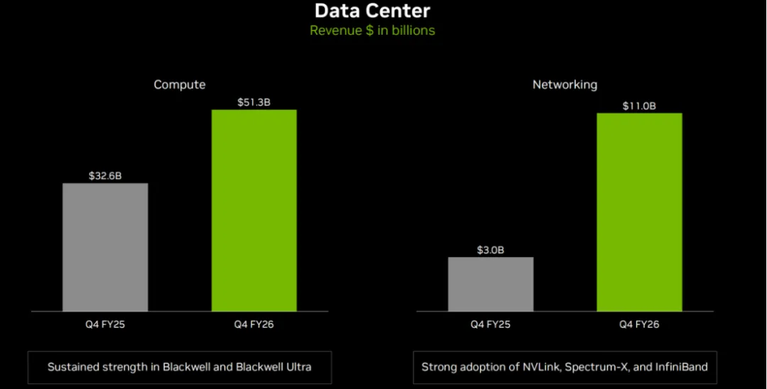 数据中心内部,计算业务收入513亿美元,同比增长58%。这很强,但还不是最值得兴奋的部分。真正亮眼的是网络业务,单季收入110亿美元,同比增长263%。这说明英伟达卖的早就不只是芯片,而是算力、互连、系统、软件一起打包的完整平台。GB200、GB300带动的NVLink体系,以太网和InfiniBand同时放量,意味着客户买英伟达,不再是单点采购,而是整套基础设施绑定。