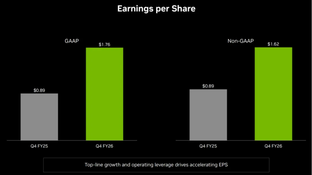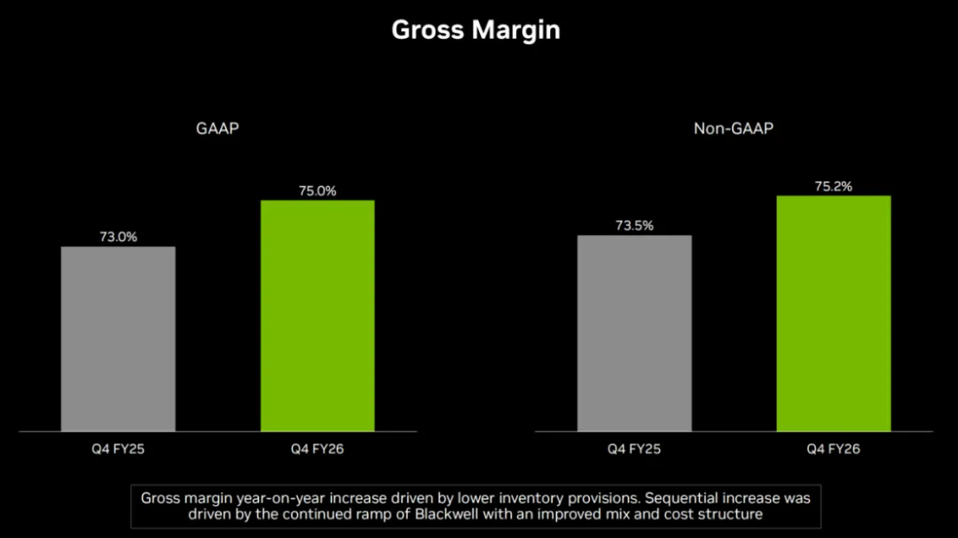 利润质量同样非常强。Q4非GAAP毛利率达到75.2%,比去年同期提升1.7个百分点,也比上季度继续改善。这个指标很关键,因为它直接说明Blackwell的产能爬坡没有拖垮盈利能力,反而开始带来更好的产品结构和成本结构。市场此前担心,新平台切换期会侵蚀利润率,现在看,至少在季度层面,这个担忧明显缓解了。