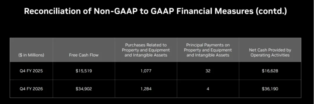 再看盈利和现金流,英伟达这份财报更有统治力。Q4非GAAP每股收益1.62美元,同比增长82%。单季自由现金流达到349亿美元。这个数字非常夸张。很多公司增长快,但现金流跟不上。英伟达的问题完全相反,它已经把AI热潮快速转化成了真金白银。对于估值来说,现金流比
