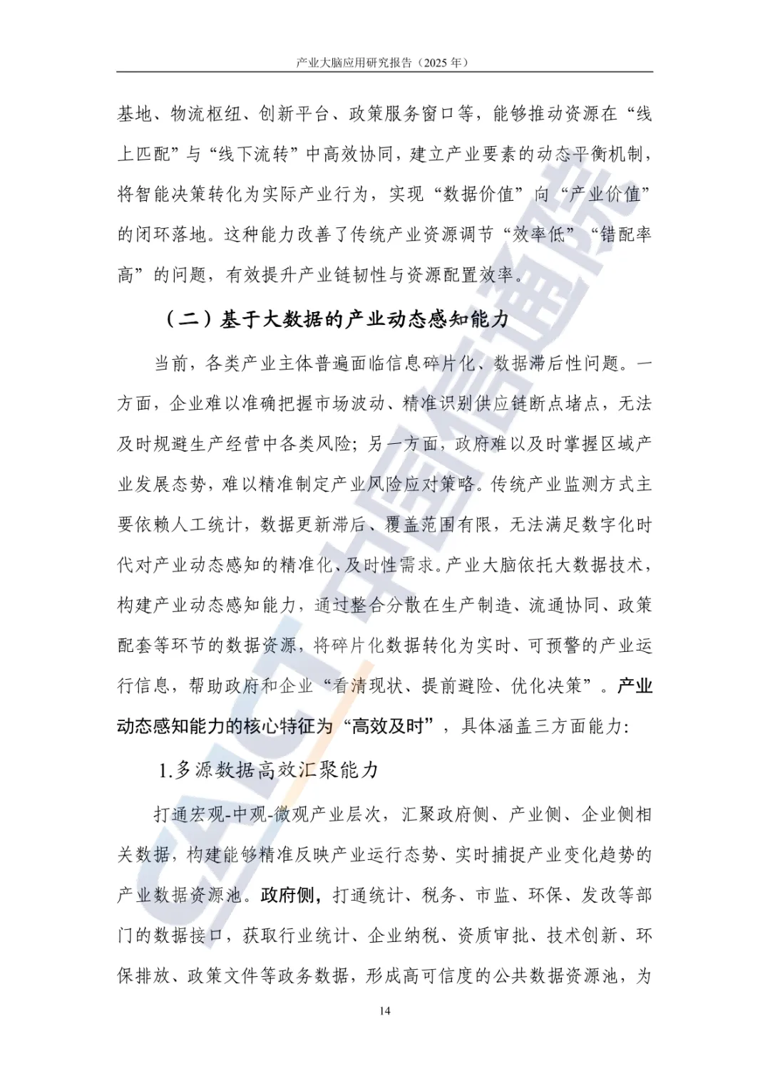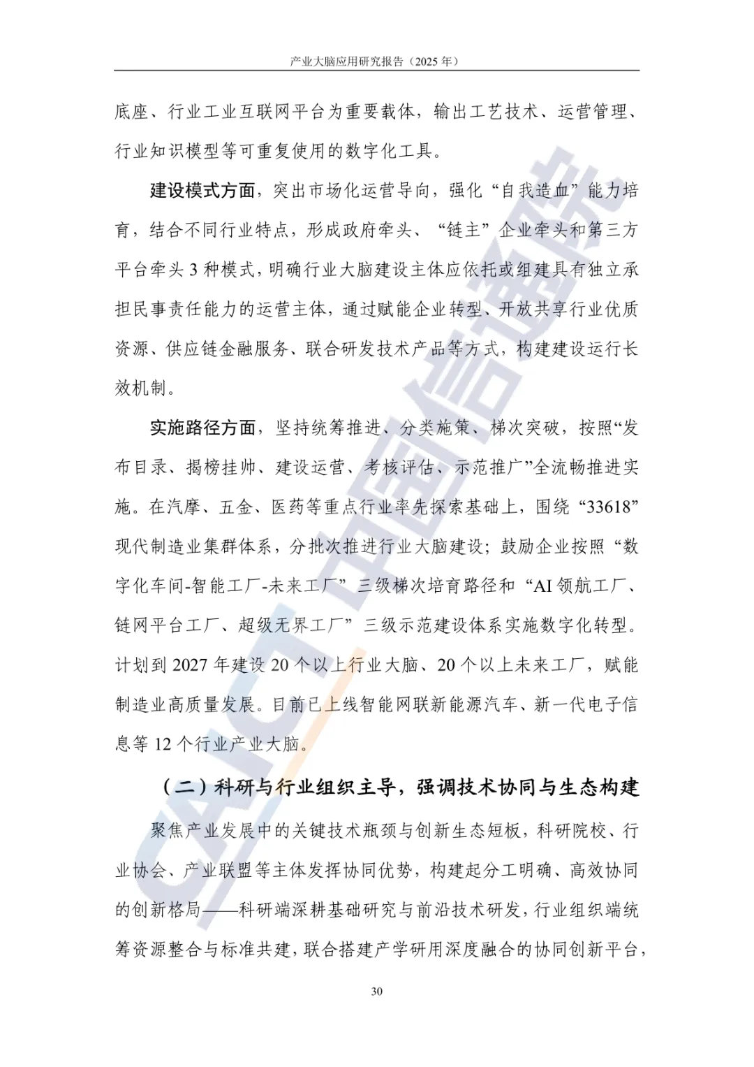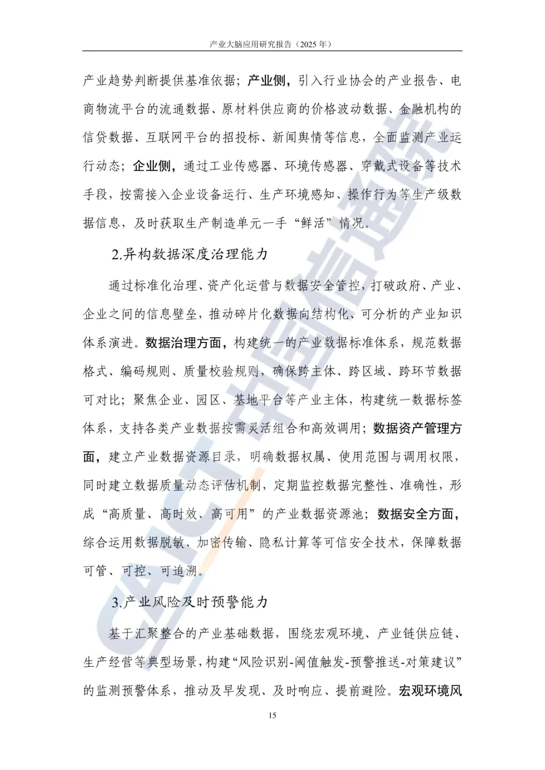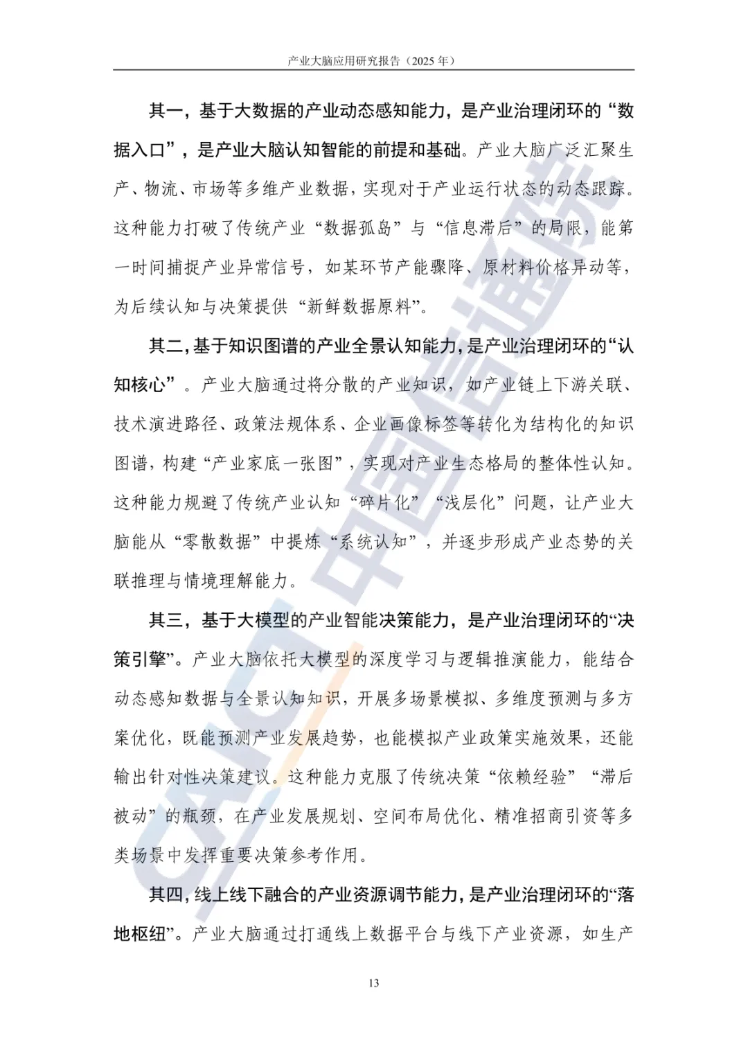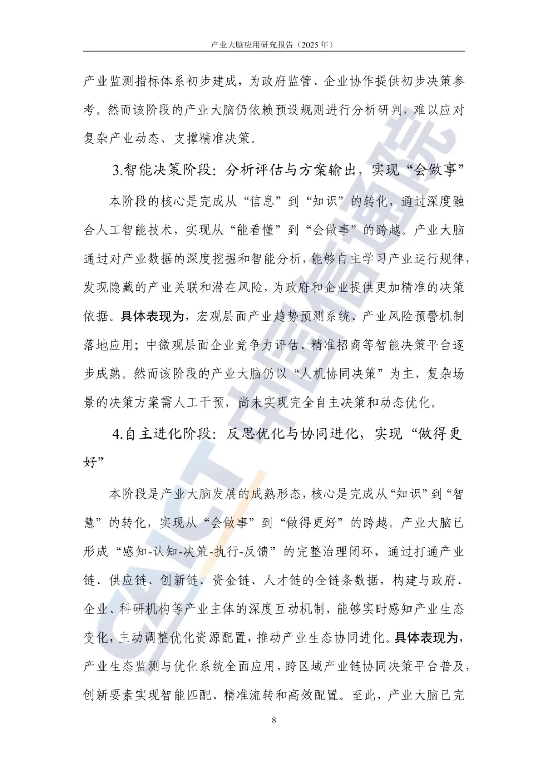 导读:报告立足建设现代化产业体系、发展新质生产力的时代背景,系统界定产业大脑为依托大数据、人工智能构建的产业级数字神经中枢,明确其在政府、产业、企业侧的核心价值。报告梳理出产业大脑基础感知、深度理解、智能决策、自主进化四大发展阶段,当前我国正处于基础感知向深度理解过渡的关键时期。报告构建起动态感知、全景认知、智能决策、资源调节四位一体的能力图谱,提炼出地方政府、科研和行业组织、企事业单位主导的三类建设应用模式,并分析各模式的特点与优劣势。报告指出我国产业大脑发展面临数据共享不充分、标准规范不统一等现实瓶颈,从生态协同、标准统一、技术赋能、模式创新、评估评价等方面提出针对性发展建议,助力产业大脑从建设走向高效可持续运营,为现代化产业体系建设提供战略支撑。