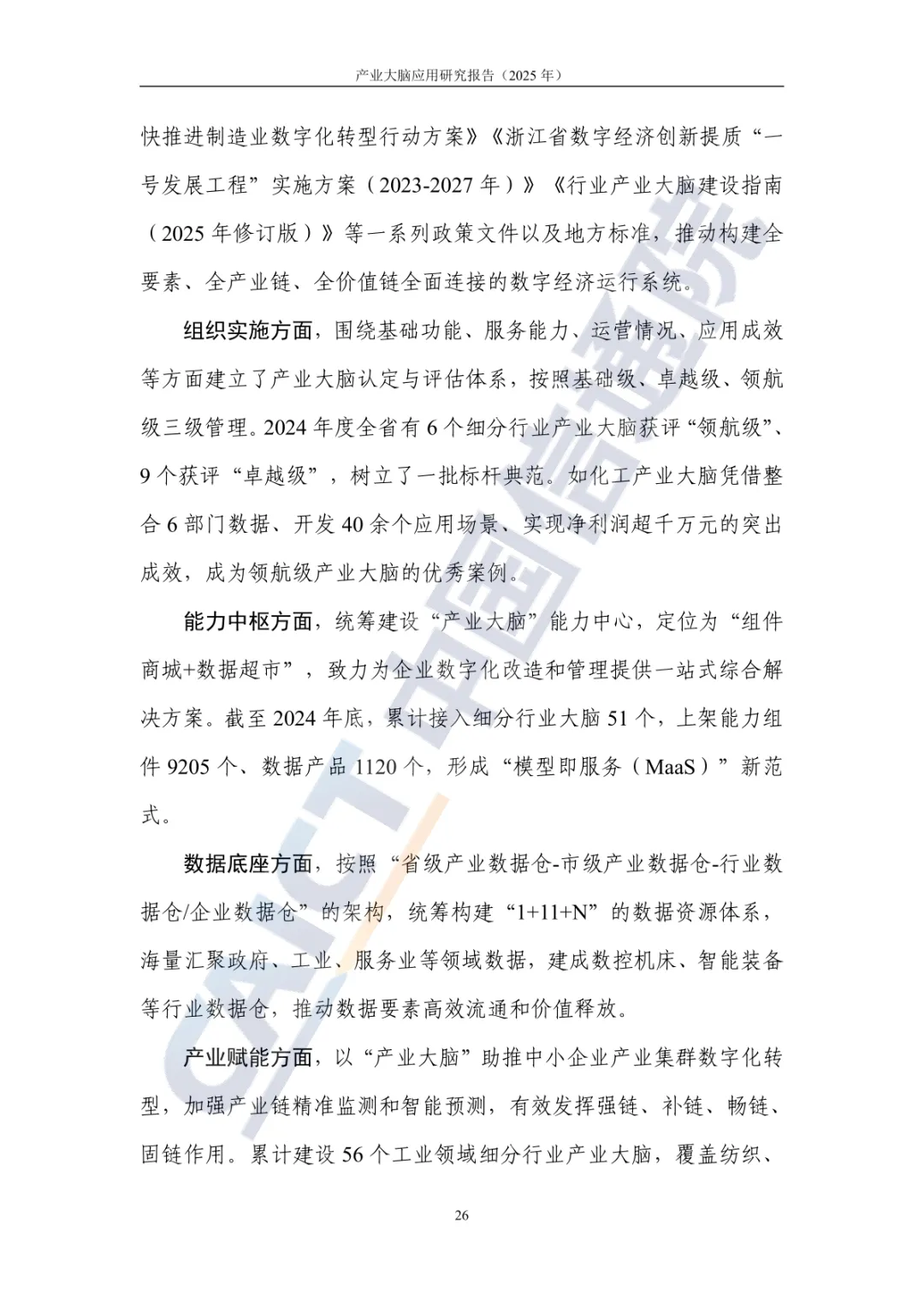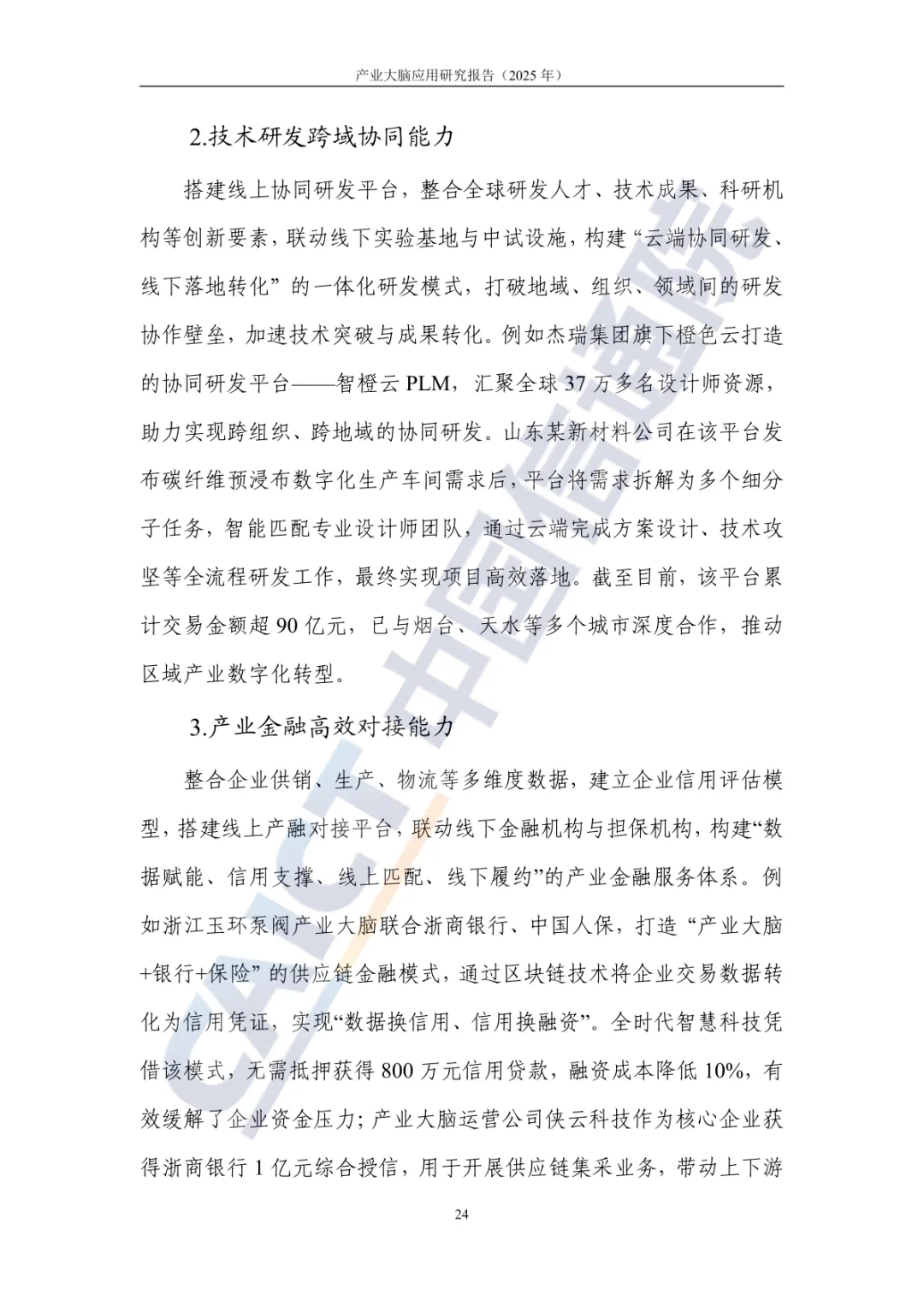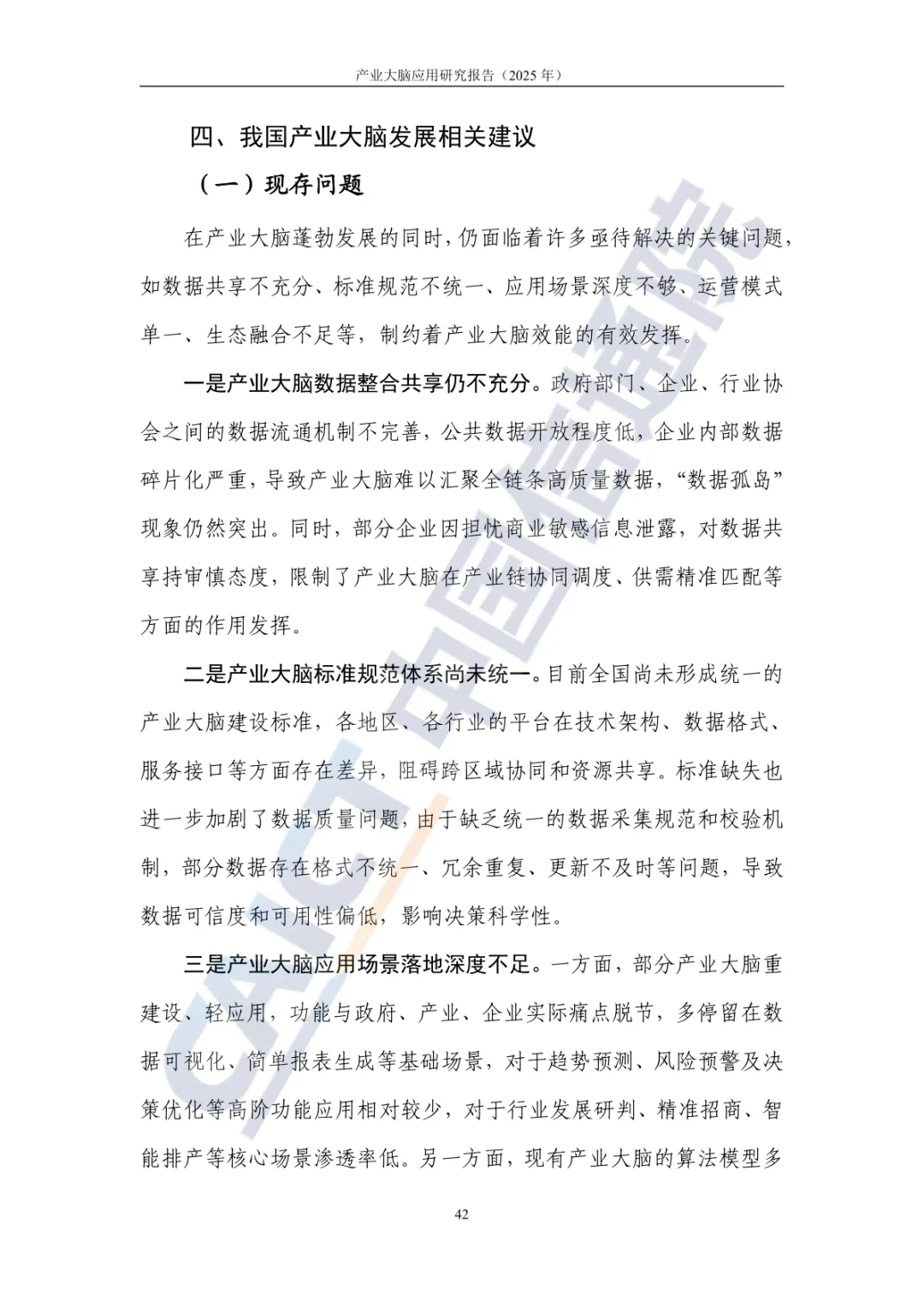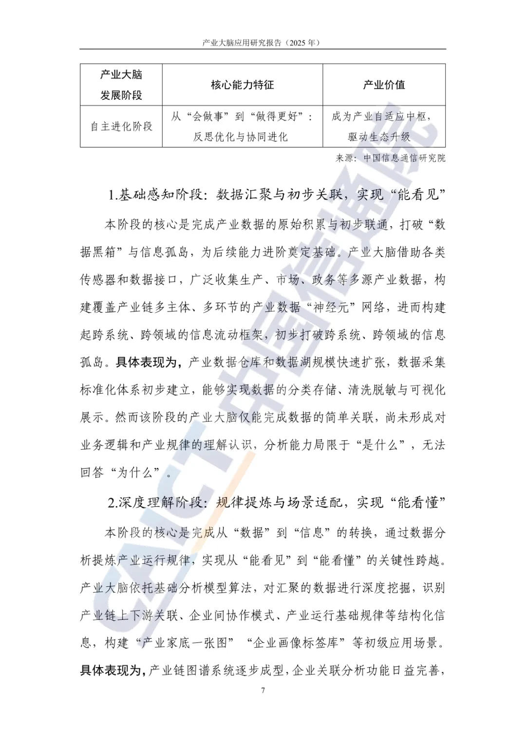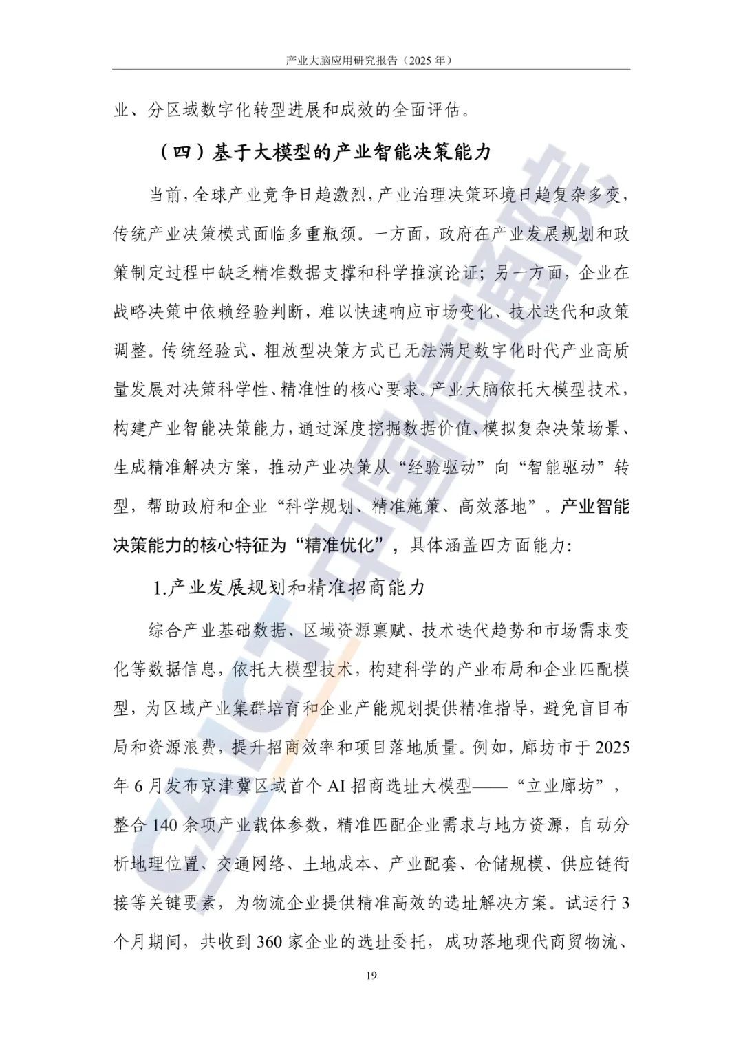 导读:报告立足建设现代化产业体系、发展新质生产力的时代背景,系统界定产业大脑为依托大数据、人工智能构建的产业级数字神经中枢,明确其在政府、产业、企业侧的核心价值。报告梳理出产业大脑基础感知、深度理解、智能决策、自主进化四大发展阶段,当前我国正处于基础感知向深度理解过渡的关键时期。报告构建起动态感知、全景认知、智能决策、资源调节四位一体的能力图谱,提炼出地方政府、科研和行业组织、企事业单位主导的三类建设应用模式,并分析各模式的特点与优劣势。报告指出我国产业大脑发展面临数据共享不充分、标准规范不统一等现实瓶颈,从生态协同、标准统一、技术赋能、模式创新、评估评价等方面提出针对性发展建议,助力产业大脑从建设走向高效可持续运营,为现代化产业体系建设提供战略支撑。