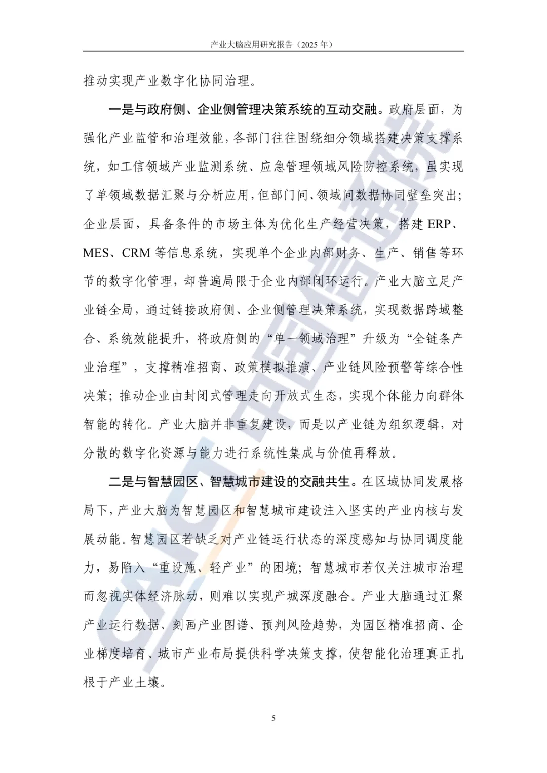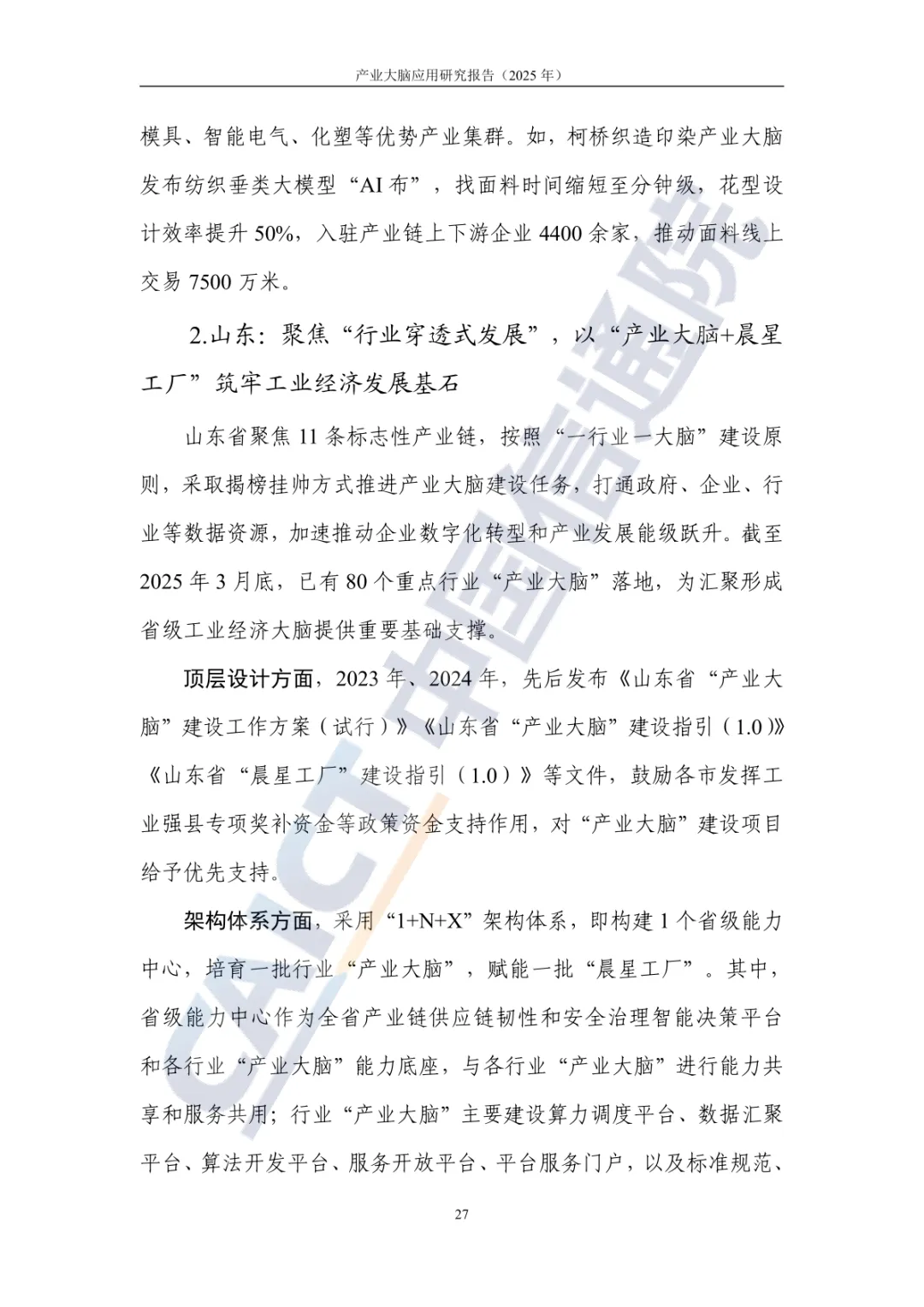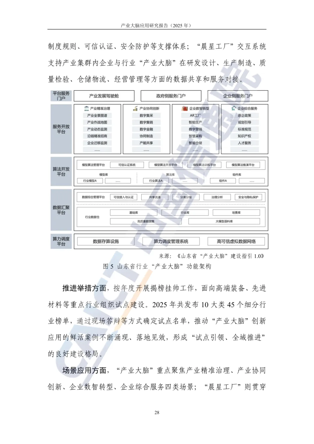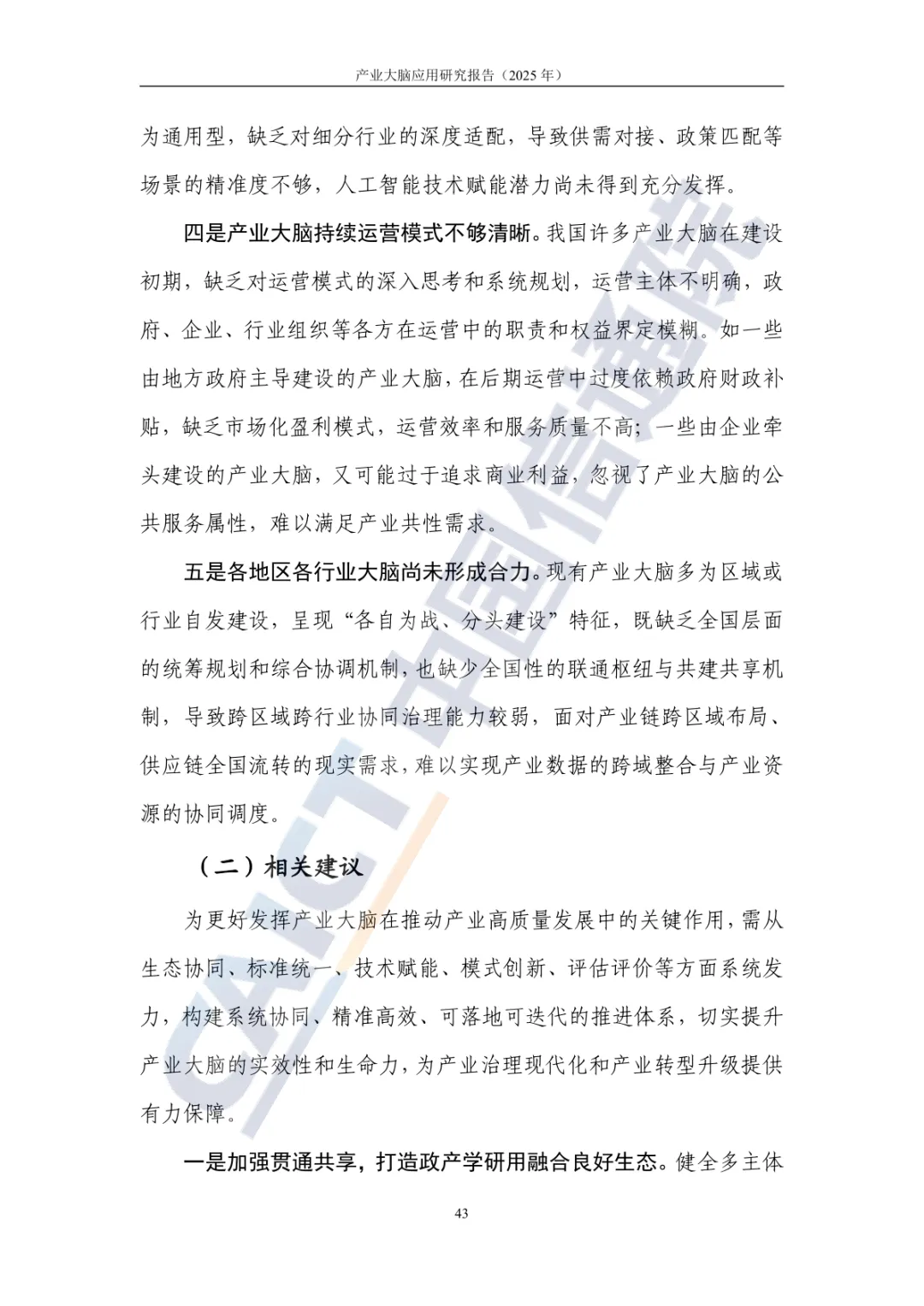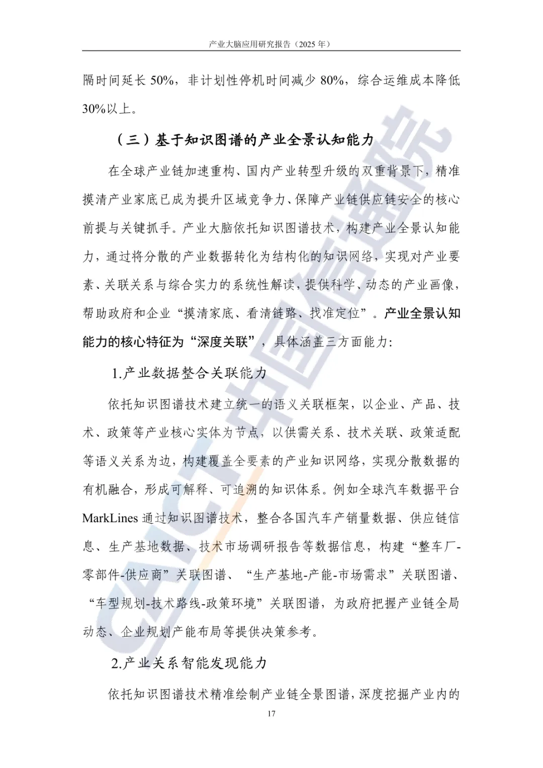 导读:报告立足建设现代化产业体系、发展新质生产力的时代背景,系统界定产业大脑为依托大数据、人工智能构建的产业级数字神经中枢,明确其在政府、产业、企业侧的核心价值。报告梳理出产业大脑基础感知、深度理解、智能决策、自主进化四大发展阶段,当前我国正处于基础感知向深度理解过渡的关键时期。报告构建起动态感知、全景认知、智能决策、资源调节四位一体的能力图谱,提炼出地方政府、科研和行业组织、企事业单位主导的三类建设应用模式,并分析各模式的特点与优劣势。报告指出我国产业大脑发展面临数据共享不充分、标准规范不统一等现实瓶颈,从生态协同、标准统一、技术赋能、模式创新、评估评价等方面提出针对性发展建议,助力产业大脑从建设走向高效可持续运营,为现代化产业体系建设提供战略支撑。
