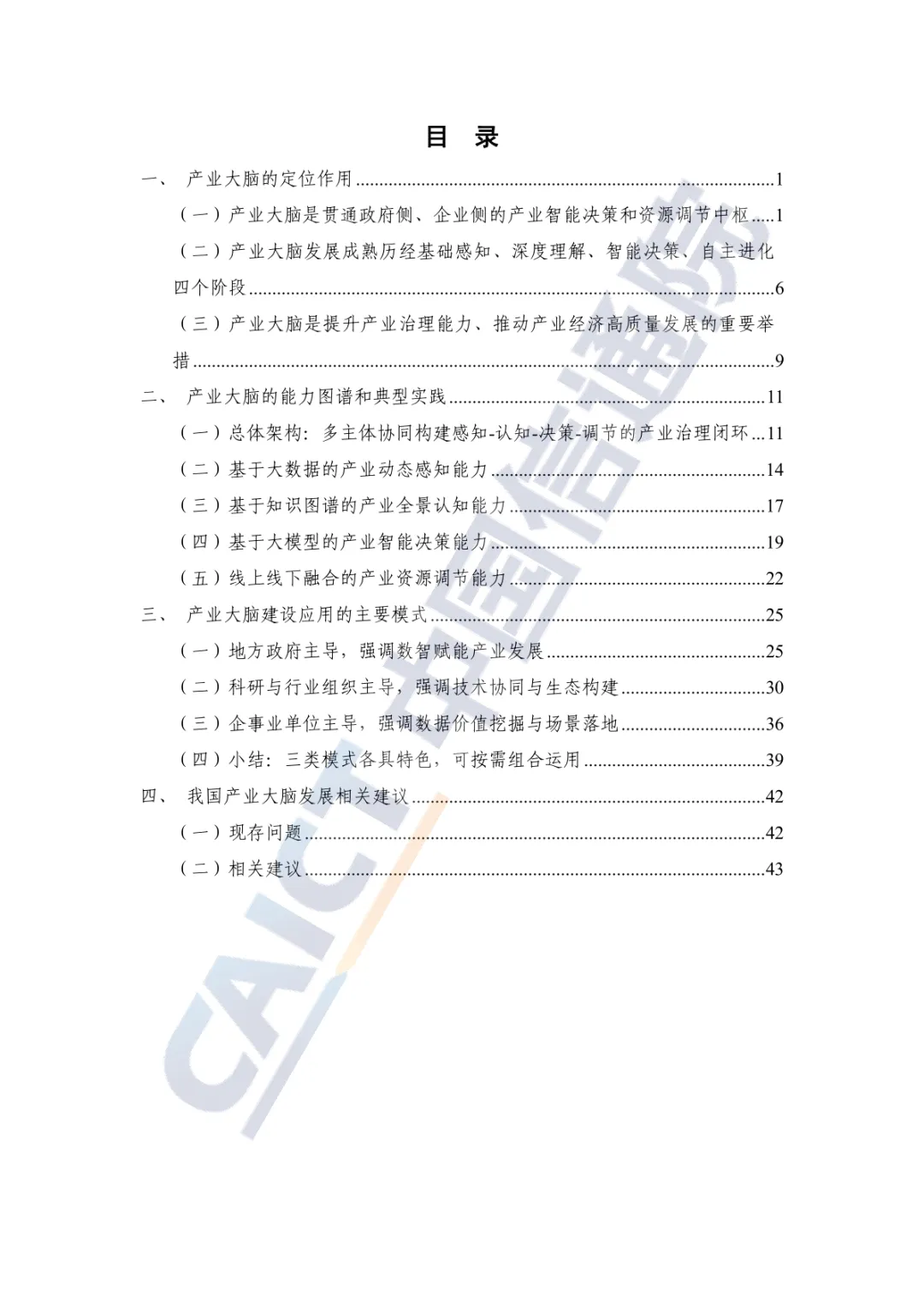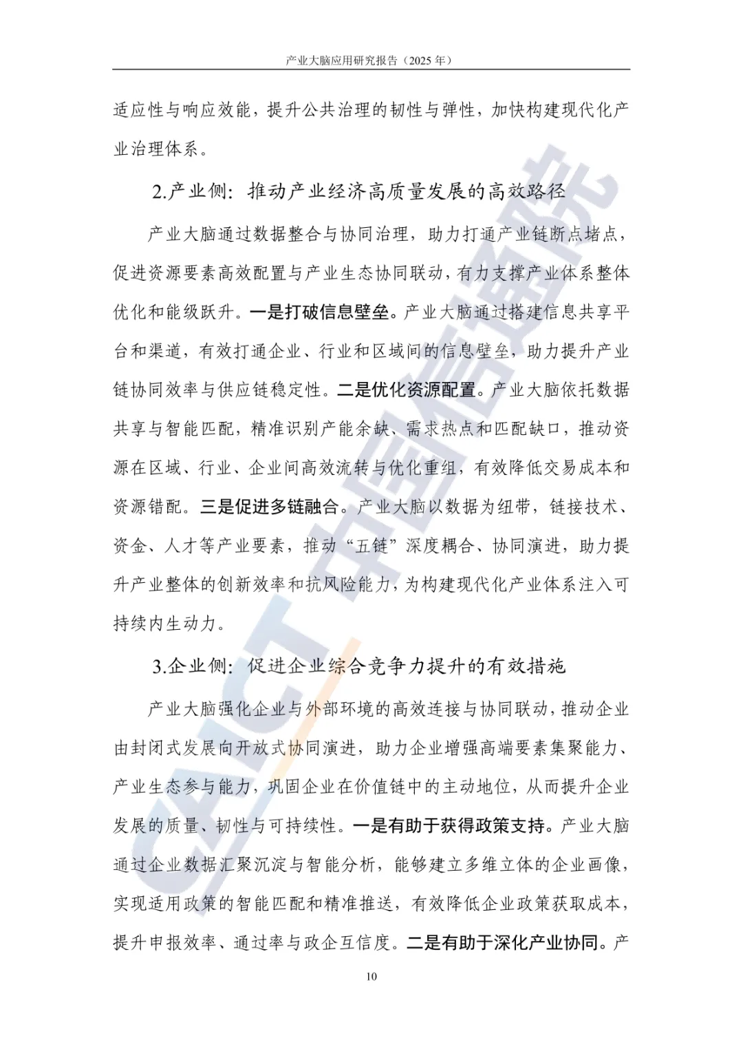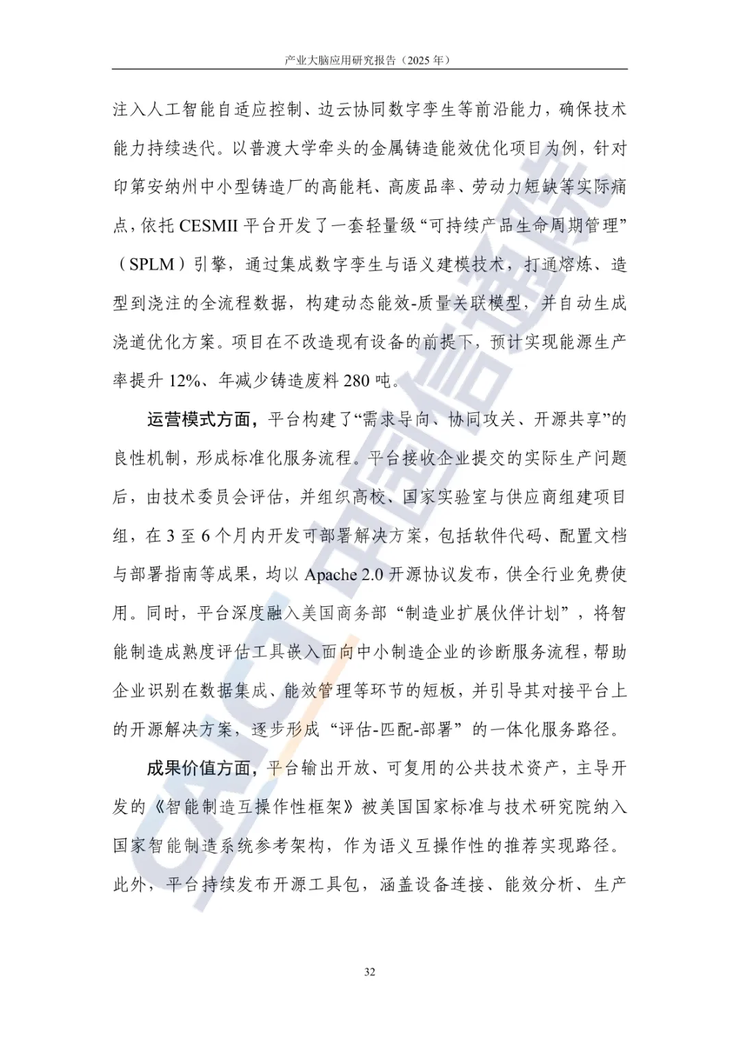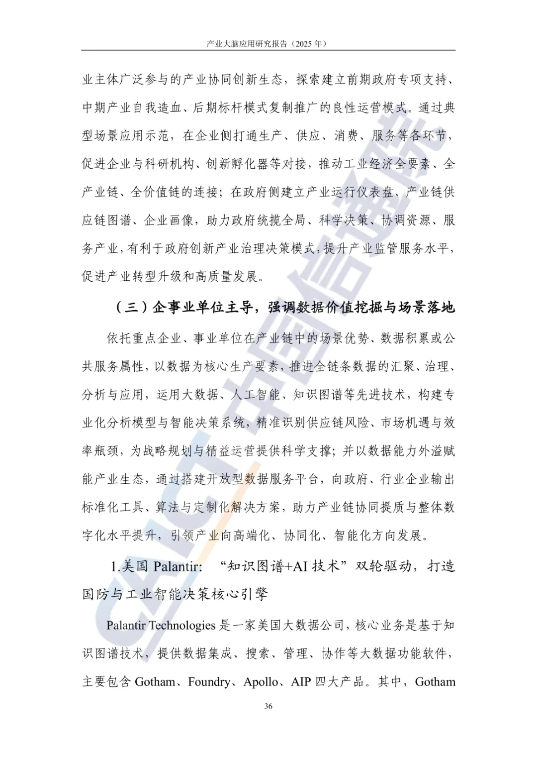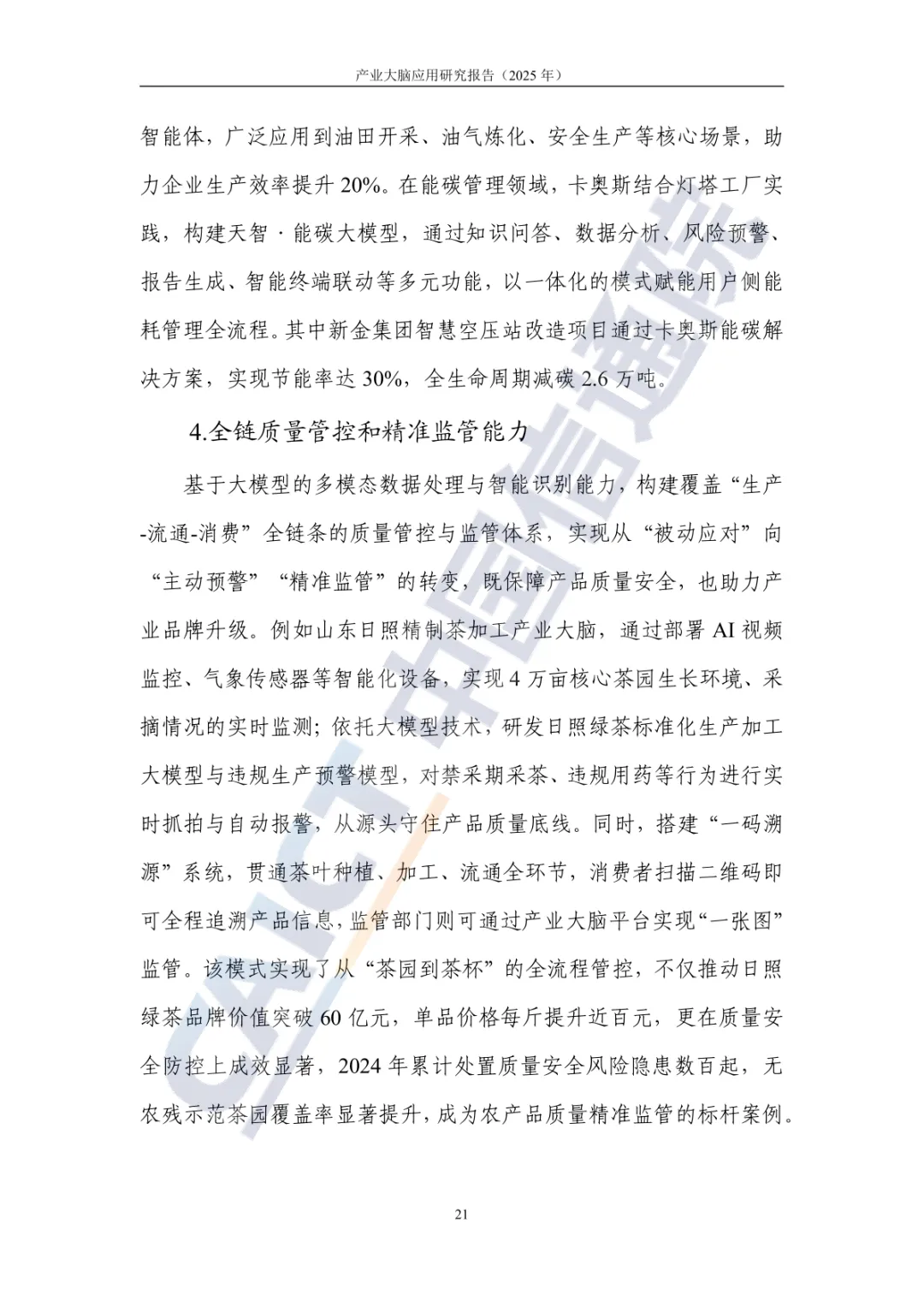导读:报告立足建设现代化产业体系、发展新质生产力的时代背景,系统界定产业大脑为依托大数据、人工智能构建的产业级数字神经中枢,明确其在政府、产业、企业侧的核心价值。报告梳理出产业大脑基础感知、深度理解、智能决策、自主进化四大发展阶段,当前我国正处于基础感知向深度理解过渡的关键时期。报告构建起动态感知、全景认知、智能决策、资源调节四位一体的能力图谱,提炼出地方政府、科研和行业组织、企事业单位主导的三类建设应用模式,并分析各模式的特点与优劣势。报告指出我国产业大脑发展面临数据共享不充分、标准规范不统一等现实瓶颈,从生态协同、标准统一、技术赋能、模式创新、评估评价等方面提出针对性发展建议,助力产业大脑从建设走向高效可持续运营,为现代化产业体系建设提供战略支撑。