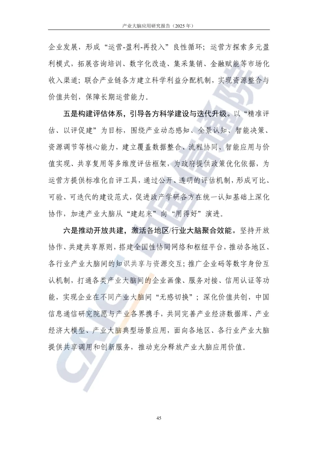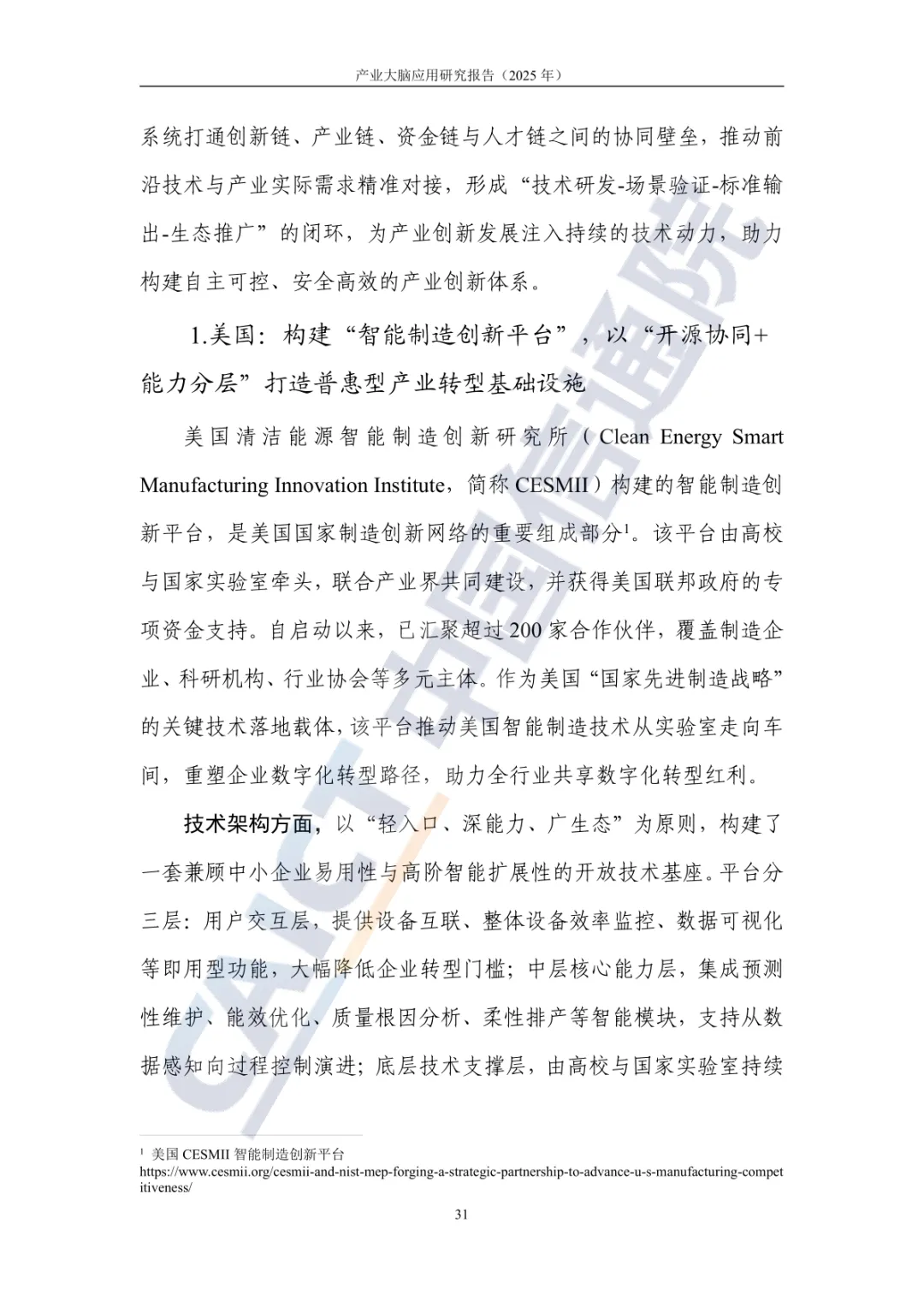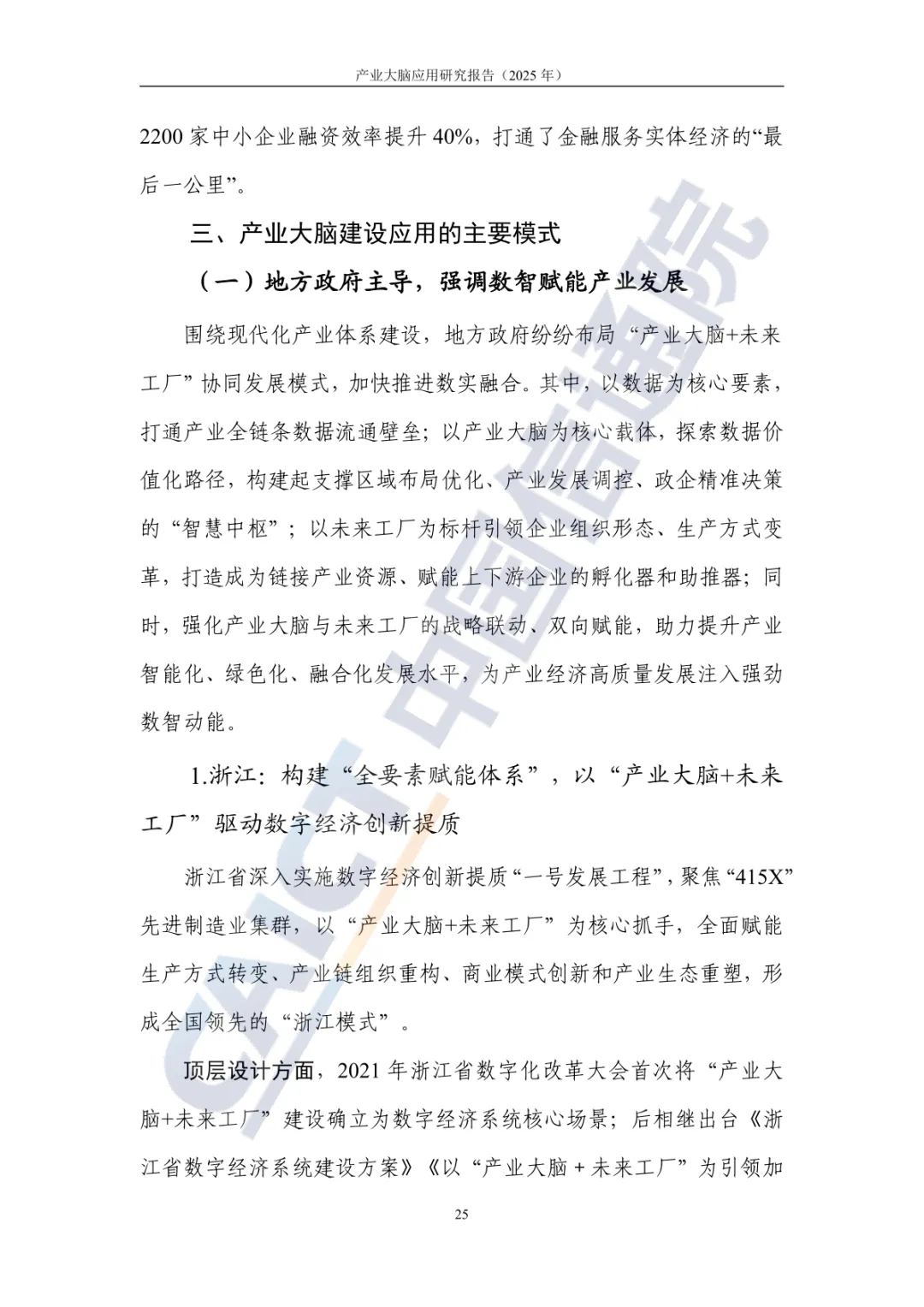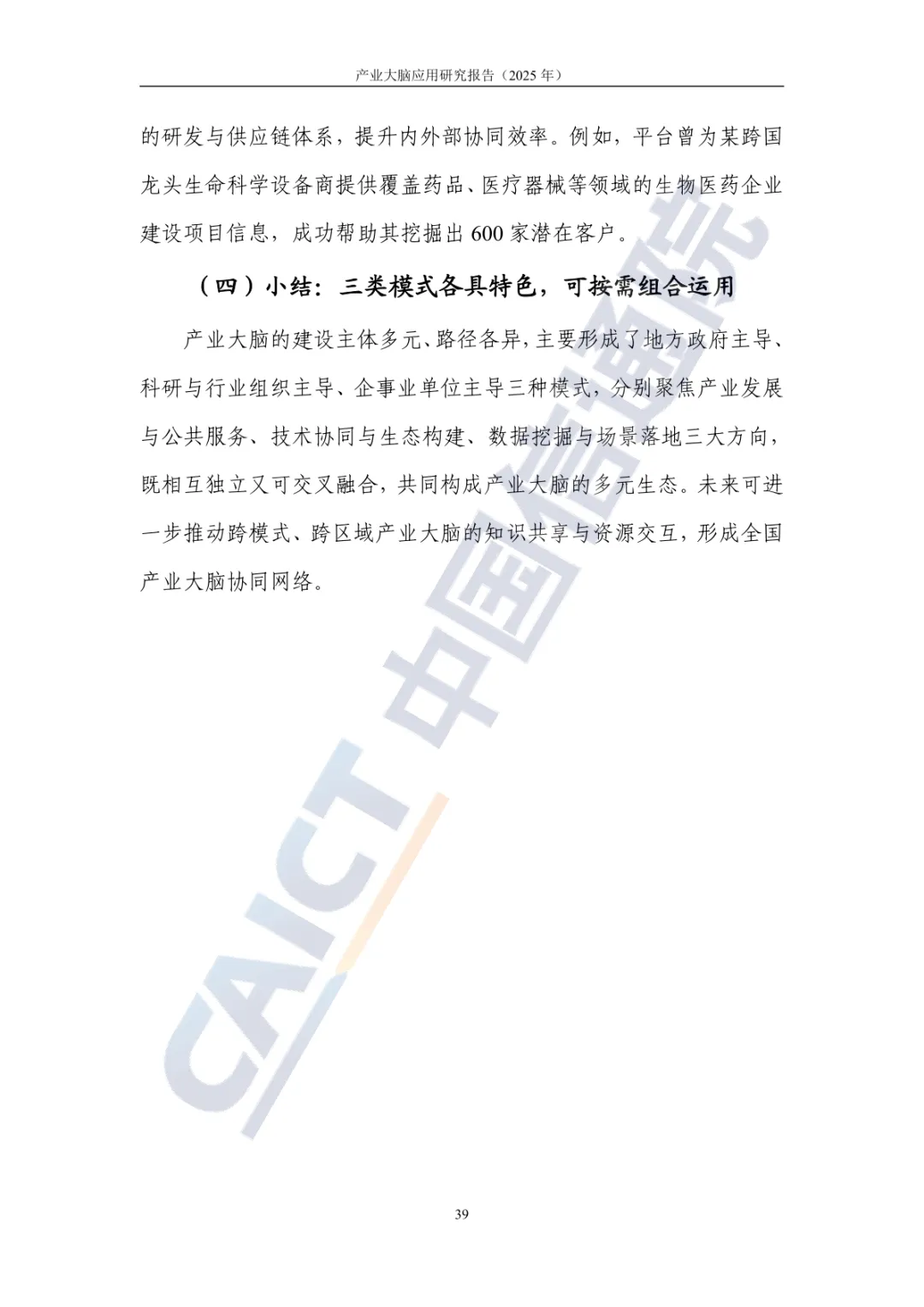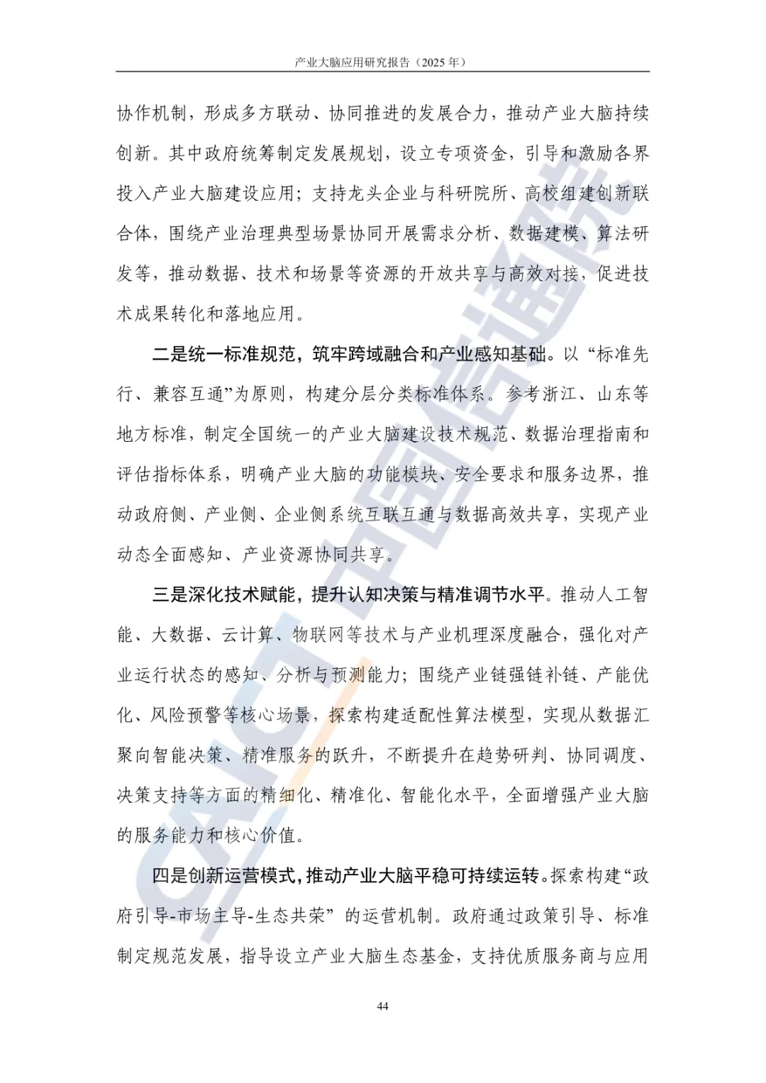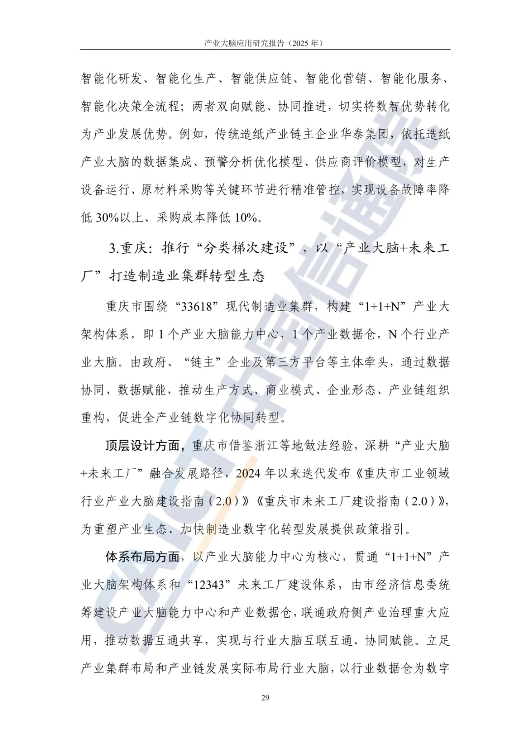 导读:报告立足建设现代化产业体系、发展新质生产力的时代背景,系统界定产业大脑为依托大数据、人工智能构建的产业级数字神经中枢,明确其在政府、产业、企业侧的核心价值。报告梳理出产业大脑基础感知、深度理解、智能决策、自主进化四大发展阶段,当前我国正处于基础感知向深度理解过渡的关键时期。报告构建起动态感知、全景认知、智能决策、资源调节四位一体的能力图谱,提炼出地方政府、科研和行业组织、企事业单位主导的三类建设应用模式,并分析各模式的特点与优劣势。报告指出我国产业大脑发展面临数据共享不充分、标准规范不统一等现实瓶颈,从生态协同、标准统一、技术赋能、模式创新、评估评价等方面提出针对性发展建议,助力产业大脑从建设走向高效可持续运营,为现代化产业体系建设提供战略支撑。