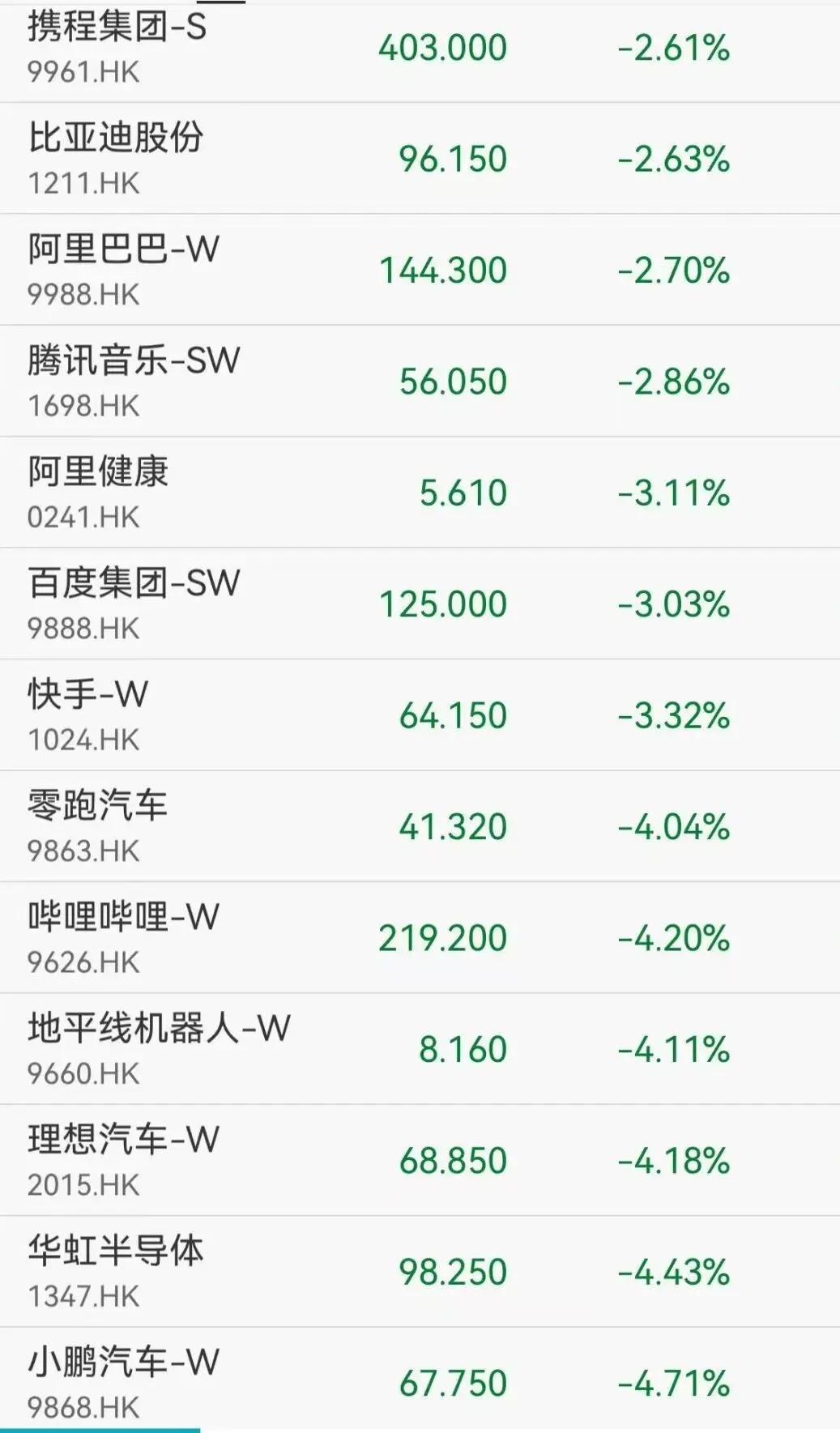 港股科网股集体下挫,华虹半导体、小鹏汽车、哔哩哔哩跌超4%,百度、快手跌超3%,腾讯音乐、阿里巴巴跌超2.7%。