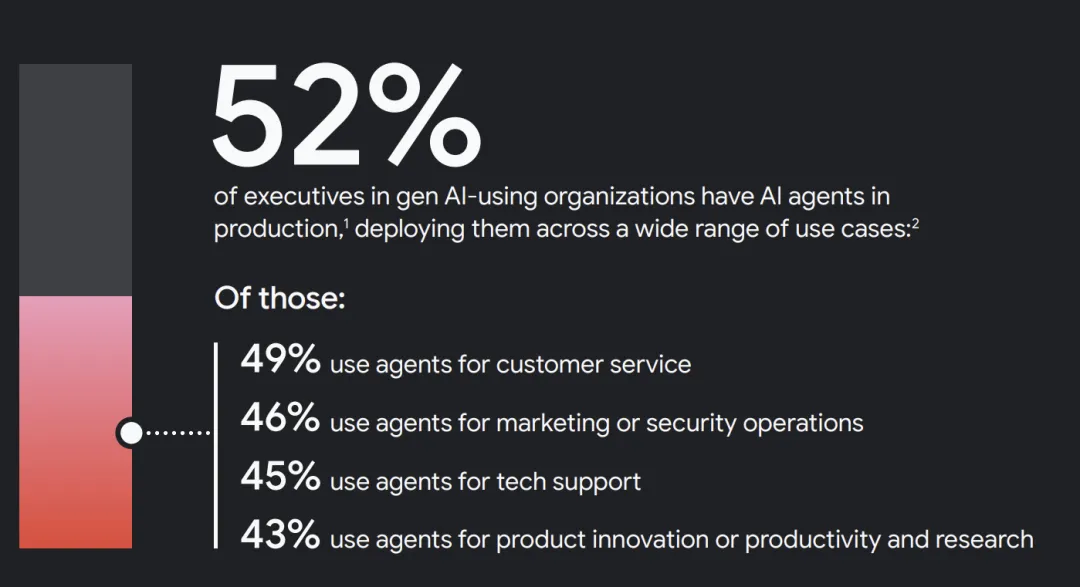 Google数据显示,52%的高管表示企业已有AI Agents在生产环境中运行。客户服务占比最高,其次是市场与安全运营、技术支持、产品创新。Agent已经越过试点阶段,进入岗位工具箱。