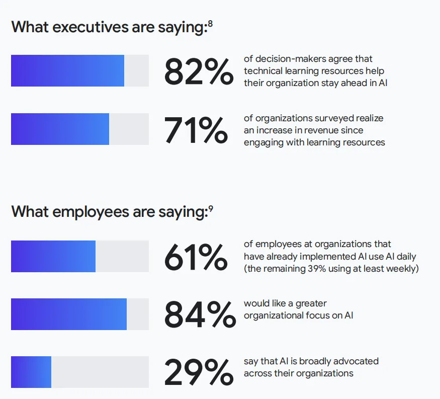 数据最能说明企业和员工对 AI 技能的迫切需求:82% 的企业决策者认为,AI 技术学习资源是企业在 AI 领域保持领先的关键;71% 的企业在开展 AI 技能培训后,实现了营收的显著增长。而从员工端来看,61% 的 AI 落地企业员工已实现 AI 日常化使用,84% 的员工希望企业能加大对 AI 能力培养的投入,只是目前仅有 29% 的企业做到了在内部广泛推广 AI 应用、普及 AI 技能。