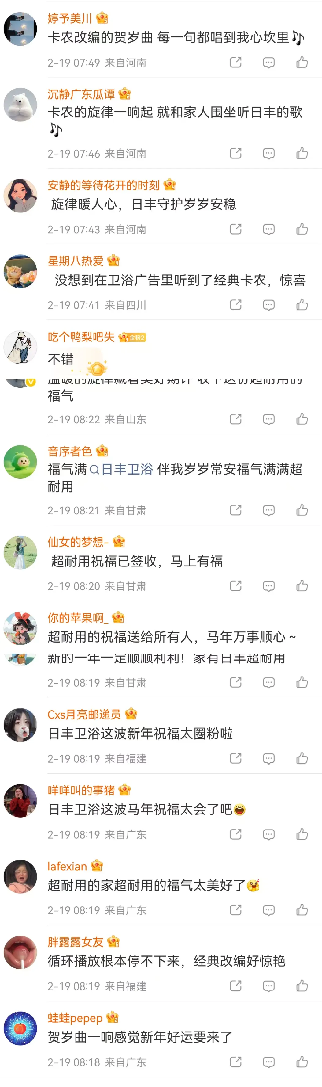 网友的评论则生动展现了这种情感连接的落地效果:有家庭用户留言“超耐用祝福已签收,马年步步高升”;还有网友感慨“卡农一响年味浓,马年福气超耐用”;更有网友自发传播“旋律暖人心,日丰守护岁岁安稳”。这些真实的用户反馈,印证了品牌将功能卖点与情感场景深度绑定的正确性,也证明了卫浴品牌的传播,唯有贴近生活、触达情绪,才能真正走进消费者心里。