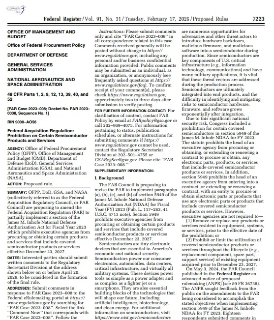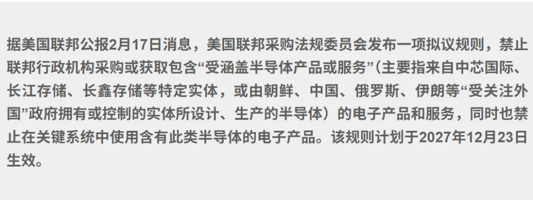 理解这一规则的残酷性,需要看清它的法律根基——2023财年《国防授权法》第5949条。该条款授权联邦采购监管委员会将半导体供应链安全纳入联邦合同体系,表面上打着“国家安全”的旗号,实则是要将中国半导体企业从美国市场中彻底连根拔起。