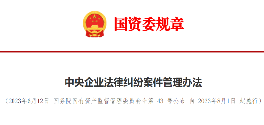2023年6月12日,国务院国有资产监督管理委员会发布《中央企业法律纠纷案件管理办法》(国务院国资委令第43号,以下简称《办法》),自 2023年8月1日起施行。