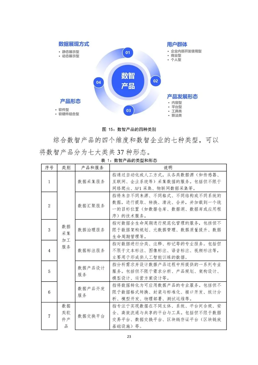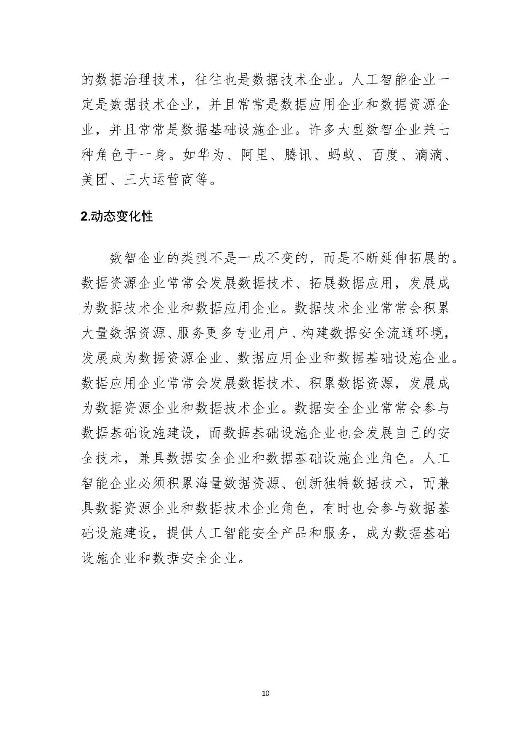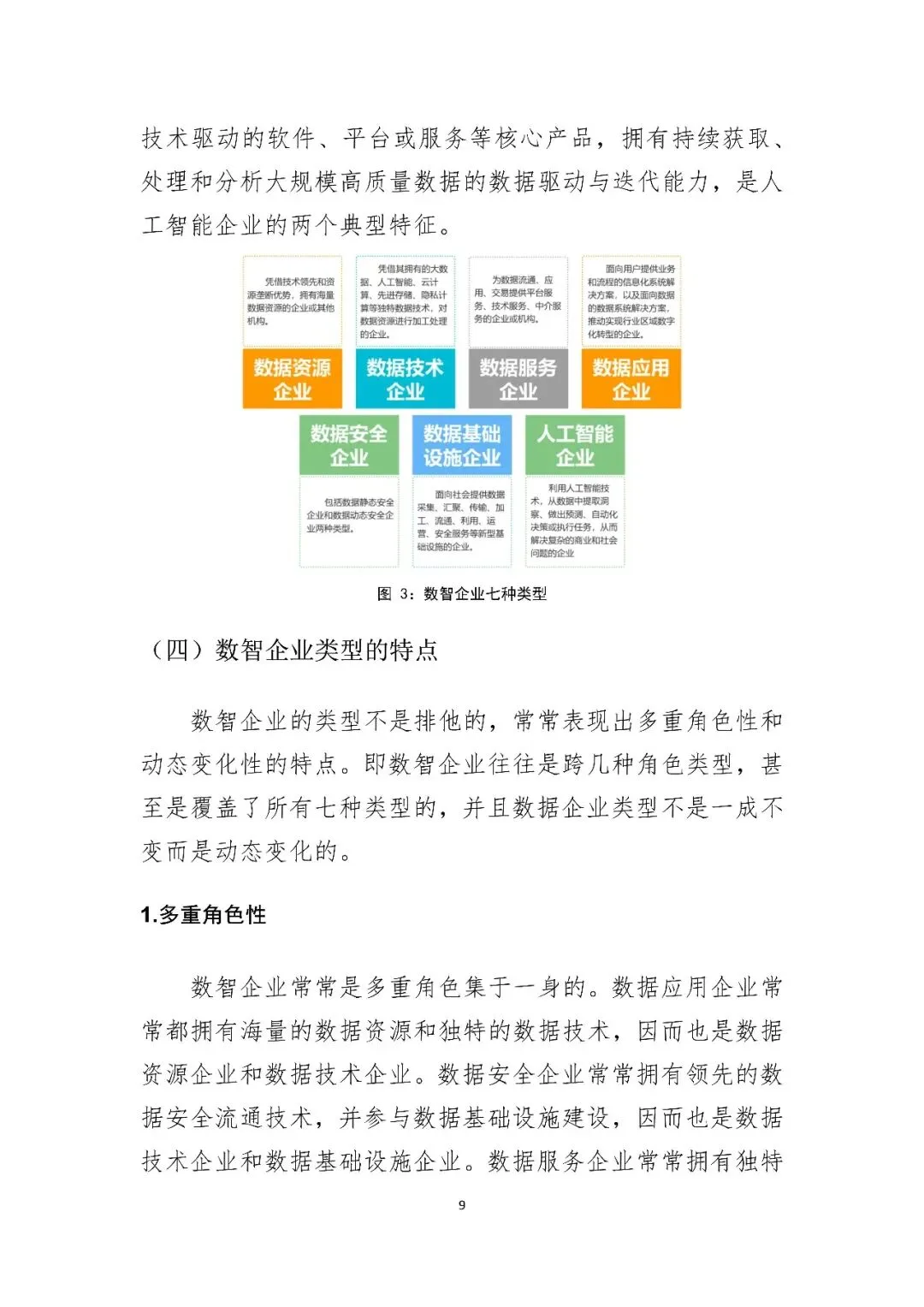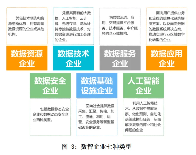 七类数智企业形态:将数智企业划分为数据资源、数据技术、数据服务、数据应用、数据安全、数据基础设施、人工智能等七类,并指出其具有“多重角色性”与“动态变化性”。