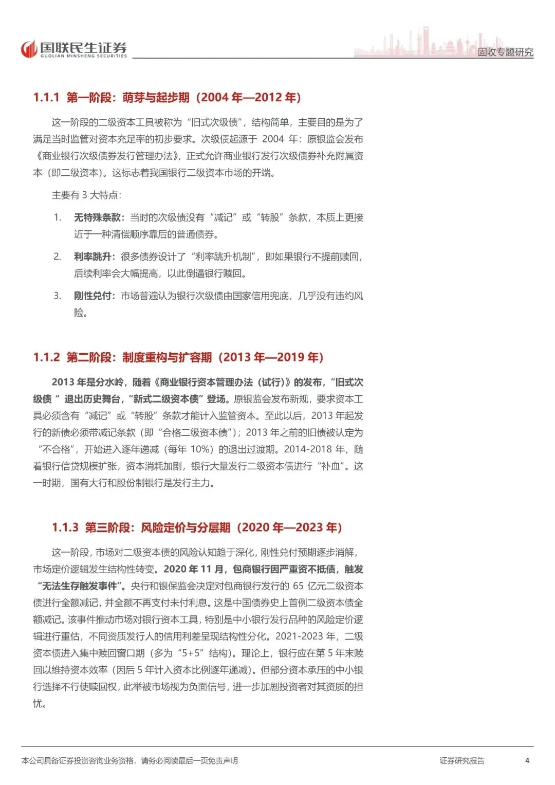 商业银行二级资本债发展史:我国商业银行二级资本债的发展大约可以分为 4 个阶段,2004 年—2012 年为第一阶段,这一阶段的二级资本工具被称为“旧式次