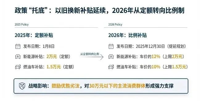 2026年,中国汽车产业正步入一个由政策定调、技术暴利进化与商业模式重构交织的深水区。随着2025年新能源渗透率跨越54%的历史门槛,行业的主旋律已从单纯的“规模博弈”转向“价值博弈”。2025年12月,国家市场监管总局发布《汽车行业价格行为合规指南》,正式向恶性价格战及“内卷式”竞争宣战。在这个宏观背景下,2026年汽车不再仅仅是移动大电池的延续,而是作为“移动算力中心”定义的全面确立和巩固。在补贴减弱与技术涌现的双重叠加下,谁能率先完成从硬件厂商到科技运营商的跨越,谁才能拿到新纪元的终极入场券。【核心看点一】政策逻辑重构:从“普惠定额”到“按价比例”的调控深意