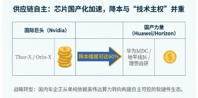 2026年的“两新”政策(报废更新与置换更新)发生了根本性的逻辑重构。补贴模式由过去的“定额制”转向“比例制”,这一微调背后隐藏着引导消费升级的巨大牵引力。补贴杠杆的精细化: 2026年报废更新补贴定为车价的12%(上限2万元),置换更新为8%(上限1.5万元)。这意味着,对于价格在16.7万至18.75万元以上的新能源车,其补贴额度才能与2025年持平。高端市场的ASP冲击: 政策正通过税收与补贴的双重调整实现“反内卷”。30万至100万价位段的车辆,其购置税减免额度从2025年的3万元降至2026-2027年的1.5万元。这一变动将直接导致该价格区间车辆的ASP(平均售价)面临1.5%至5%的结构性上浮。分析师见解: 这种政策转向标志着政府正从“撒胡椒粉”式的普惠补贴转向结构性引导。通过提高中高端购车门槛和补贴权重,政策正在迫使车企放弃低毛利的规模陷阱,转向追求更高技术附加值的价值竞争。【核心看点二】利润保卫战:自研芯片已作为抵御原材料“双涨”的战略对冲必选项
