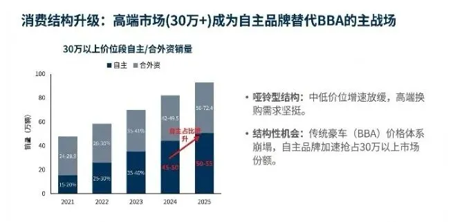 在30万以上的高端赛道,一场关于“豪车定义权”的更迭已接近尾声。这不仅是销量的替代,更是“机械豪华”向“科技豪华”的代际跃迁。数据预警: 自主品牌在30万以上市场的份额已从2021年的12%暴涨至2025年的51%,预计2026年将突破60%。品牌资产重组: 随着BBA等传统燃油豪华品牌步入结构性衰退,其品牌溢价正在快速消失。自主品牌通过高阶智驾和自研算力,重塑了高端市场的“入场标准”。2026年,如果一款30万以上的车型不具备端到端智驾和超1000 TOPS的算力,它将彻底丧失与自主豪华品牌博弈的资格。【核心看点四】AI算法的“质变时刻”:VLA与世界模型开启智驾下半场