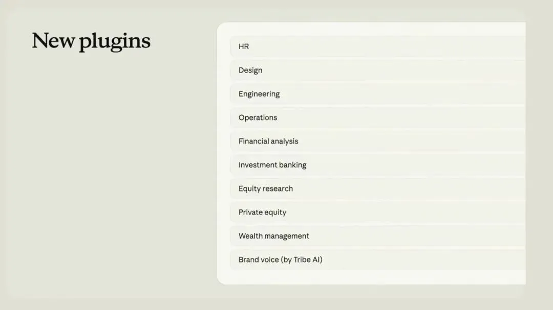 大量新连接器和垂直插件 新增了 Google Workspace、FactSet、Slack 等大量连接器。针对投行、私募、HR、设计等十多个岗位提供专属模板,这些模板由行业从业者深度共创,确保了工作流程、术语体系和输出格式完全贴合真实的专业场景。