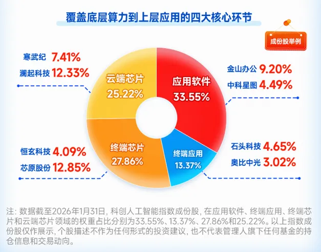 科创人工智能ETF华宝(589520)及其联接基金(联接A:024560,联接C:024561)重点布局国产AI产业链,成份股囊括国产GPU龙头(如寒武纪),国产ASIC龙头(如芯原股份)、AI应用龙头(如金山办公),半导体行业权重占比近一半,具备较强进攻性;软件行业权重占比超三成,有望受益于AI应用补涨行情。同时,该ETF是融资融券标的,是一键布局国产算力的高效工具。