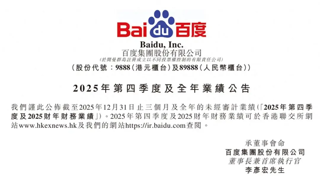 刚刚,百度发布了2025年Q4及全年业绩公告。