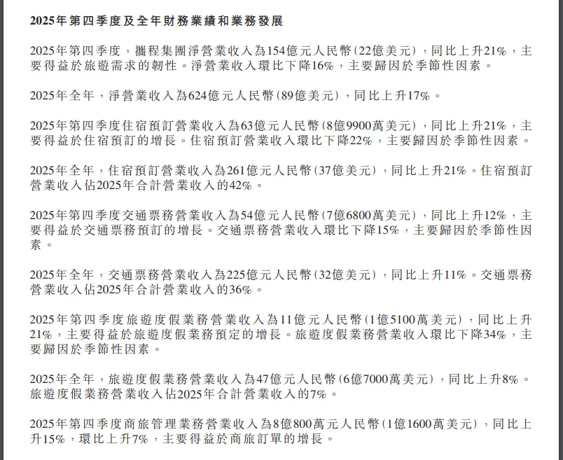 2025年全年,携程集团净营业收入为624亿元,同比上升17%。净利润为334亿元,相比2024年净利润为172亿元人民币。同比增加主要由于2025年全年包含在其他(支出)╱收入中的投资利得199亿元人民币(28亿美元),相比2024年为11亿元。