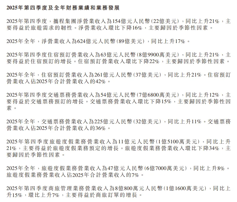2025年全年,携程集团净营业收入为624亿元人民币(89亿美元),同比上升17%。净利润为334亿元人民币(48亿美元),相比2024年净利润为172亿元人民币。同比增加主要由于2025年全年包含在其他(支出)/收入中的投资利得199亿元人民币(28亿美元),相比2024年为11亿元人民币。2025年全年国际OTA平台总预订同比增长约60%,全年服务入境旅客约2000万人次。