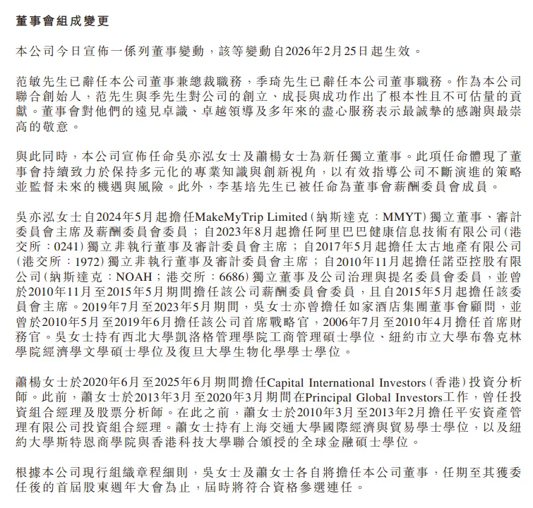 此外,携程还公布了一系列董事变动,变动自2026年2月25日起生效。
