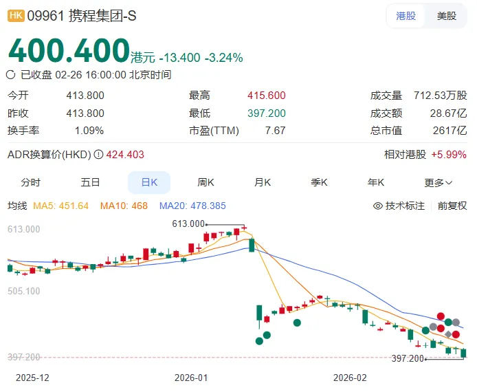 截至2026年2月26日收盘,携程集团-S(09961.HK)股价大跌3.24%,报收400.400港元/股。