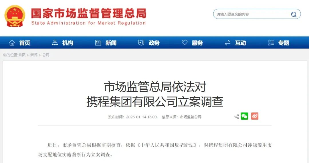 据中国城市报2026年1月14日消息,市场监管总局根据前期核查,依据《中华人民共和国反垄断法》,对携程集团有限公司涉嫌滥用市场支配地位实施垄断行为立案调查。