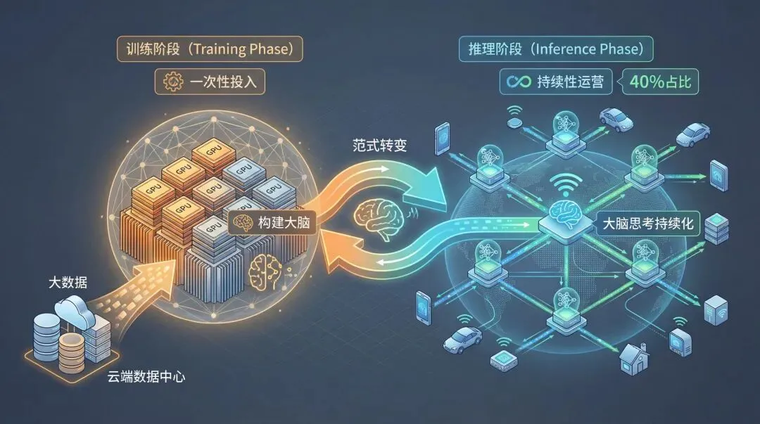 过去两年,AI 产业的投资主要集中在训练阶段——用海量数据训练大模型。这推动了英伟达 A100/H100 芯片的爆发式增长。但现在,风向正在转变。