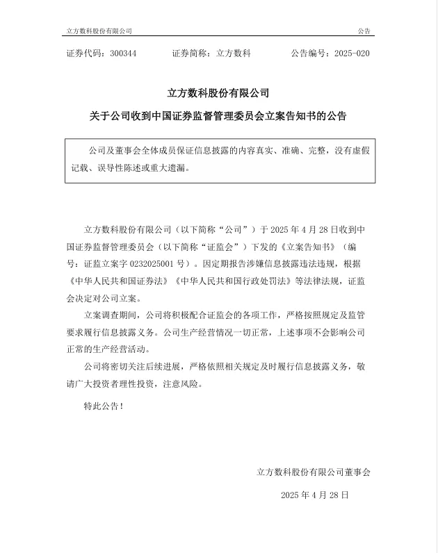 立方数科股份有限公司于2025年4月28日收到中国证券监督管理委员会下发的《立案告知书》(编 号:证监立案字0232025001号)。因定期报告涉嫌信息披露违法违规,根据《中华人民共和国证券法》《中华人民共和国行政处罚法》等法律法规,证监会决定对公司立案。