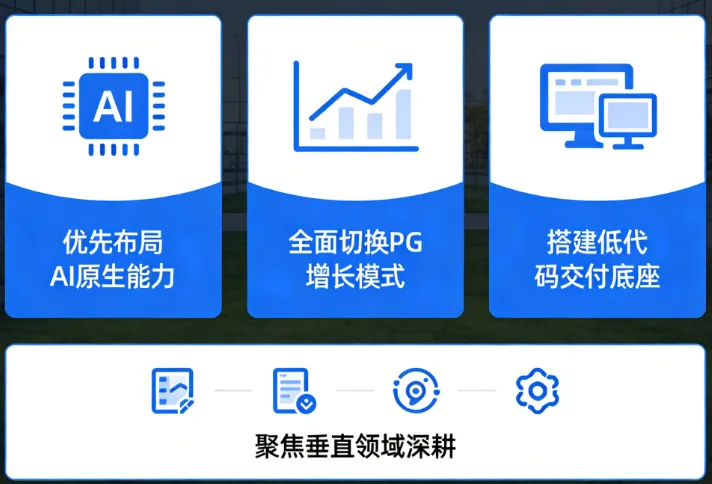 3. 以低代码为交付底座:通过低代码平台,快速适配不同行业、不同客户的个性化需求,缩短交付周期、降低定制成本,支撑PLG模式的规模化扩张;同时,AI与低代码的融合,让业务人员可自主完成应用搭建,进一步降低用户使用门槛,推动PLG裂变增长,实现“规模化交付+个性化体验”的平衡。