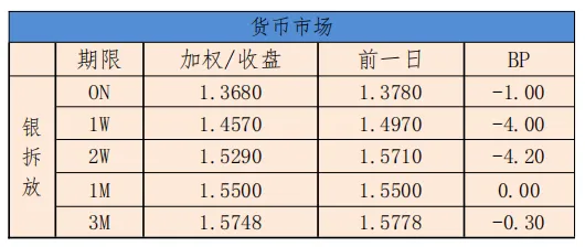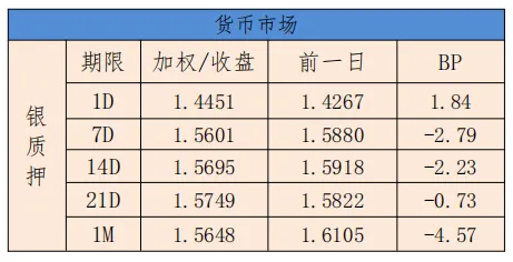 今日银行间市场主要回购利率整体下行。隔夜加权平均利率收盘于1.4451%,上日的收盘价为1.4267%,上行1.84BP;14天收盘价为1.5595%,相比较昨天的收盘价格1.5918%,下行2.23BP。