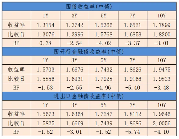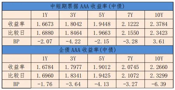 中债中短期票据收益率曲线(AAA)1年期收益率下行2.07BP,至1.6673%,3年期收益率下行4.22BP,至1.8042%。
