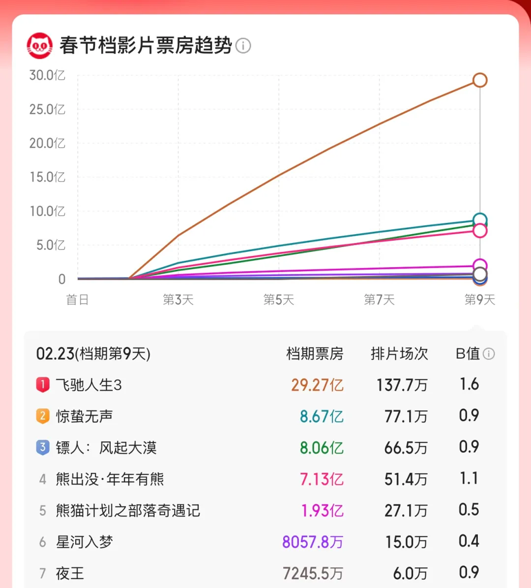 《镖人》高达7亿元的制作成本,意味着它需要突破21亿票房才能回本。虽然它凭借豆瓣7.5分的口碑实现了连续逆跌,并超越了原本排片更高的《惊蛰无声》,但受众的错位是致命的。硬核武侠吸引的是中年男性,这与春节档主流的合家欢需求格格不入。即便它成为了中国影史武侠片票房冠军,但对于片方而言,这依然是一场亏损可能达数亿的悲壮冲锋。