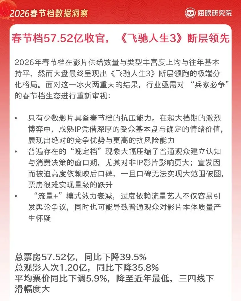 2026年的春节档以57.52亿元的成绩落下了帷幕。相比于2025年近百亿的狂欢,这个超长假期的票房大盘直接缩水了近四成。当潮水褪去,我们才发现,这场被寄予厚望的开年之战,不仅没有成为全行业的强心剂,反而像一面冷酷的镜子,照出了目前中国电影产业深层次的结构性危机。如果我们跳出单部影片的票房数字,从整个产业运行逻辑的角度来审视,就会发现,2026年的中国电影市场,正在面临一场前所未有的持续衰退与重塑。让人无法忽视的是,大环境的寒气已经实质性地传导到了电影终端,整个电影行业的持续衰落已是不争的事实。从宏观消费逻辑来看,在整体经济面临周期性调整的当下,大众的可选消费能力明显减弱,电影票虽然降到了近六年来最低的平均47.8元,但观众在掏钱时依然变得极其审慎。更致命的打击来自于外部娱乐方式的“降维替代”。根据相关行业数据报告,2025年中国微短剧与漫剧的总产值已经达到了惊人的1000亿元,这个数字几乎是同期全国电影总票房(518.32亿元)的两倍。短剧凭借着“短平快、节奏密、情绪强”的特质,像黑洞一样疯狂吞噬着大众每天仅有的几个小时休闲时间。当人们习惯了足不出户就能在手机上获取高浓度的情绪多巴胺时,走进影院的决策成本就被无限放大了。此外,中国电影院的生存极度依赖于商场生态,大多影院处于商场消费圈内,随着实体商场客流的整体衰落,这种唇亡齿寒的共生关系,直接导致了影院终端的客流锐减。其次,伴随着大盘的萎缩,头部影业公司正在经历一场让人心惊肉跳的资本大撤退。曾经在市场上呼风唤雨的传统巨头们,如今大多举步维艰。我们在近期的财报和市场表现中看到,华谊兄弟、博纳影业等老牌劲旅前三季度亏损严重,博纳的销售毛利率甚至一度跌至惊人的负数,主投影片的票房根本无法覆盖高昂的制作与宣发成本。而北京文化、华策影视等公司,要么深陷债务泥潭处于破产边缘,要么为了自保直接裁撤或大幅缩减了电影部门。即使是目前账面上看起来还算风光的幸存者,比如光线传媒和中国儒意,其繁荣也大多建立在对极少数超级爆款(如光线的《哪吒之魔童闹海》)的绝对依赖上。盘点一下各大公司的未来片单就会发现一个残酷的事实:除了成功作品的续集,市场上几乎已经看不到敢于砸下重金的大制作原创纯新片。资本的逻辑已经变成了“不求有功,但求无过”。去年做低成本片子比较多的麦特估计不再敢轻易冒险,而拥有较强实力的壹同传奇(陈思诚)和亭东影业(韩寒)在接下来的项目开发中,也必然会采取极其保守和谨慎的防御性策略。前两天,圈内疯传传统影视巨头华策影视要解散电影部门,传言称因主控项目连续亏损导致“资金不再对电影赛道抱有希望和幻想”,引发业内哗然。华策紧接着火速辟谣,强调公司并未解散该部门,而是正在全面推进“内容+科技”战略升级,将AI技术作为驱动内容创新的核心动力,对包括电影在内的全板块进行转型。同时宣布,2026年电影业务将不再盲目追求规模,而是坚守“收支平衡”的底线,优先修复现金流。不过,懂行的都能听出来,所谓‘拥抱AI’不过是句漂亮话,骨子里透出的依然是极其悲观的退守信号。在资本语境里,“不再追求规模”和“死守现金流”,其实就是“大幅削减预算”与“战略性业务收缩”的委婉表达。这意味着,连华策这样的巨头都失去了在电影赛道继续豪赌大制作的底气,只能寄希望于AI降本增效,彻底转入“蛰伏保命”的防御姿态。第三个核心危机,是产业资源的极度固化,投资正在疯狂聚焦于经过市场反复验证的极少数导演身上。在如今的资本严冬里,能让投资人痛快掏钱的导演已经屈指可数。也正是因为资本的“避险逻辑”导致了今年春节档内容的同质化与保守。纵观今年片单,几乎是“老熟人”的天下。《飞驰人生3》、《熊出没·年年有熊》、《熊猫计划2》,续集与IP占据了半壁江山。资本为了求稳,过度依赖成熟IP和流量公式,导致创作者停留在舒适区。虽然《飞驰人生3》凭借沈腾的国民度和成熟的工业化水准拿下了近30亿票房,占据了档期的半壁江山,但这种“一超多弱”的格局掩盖不了中腰部影片的集体失语。缺乏真正的惊喜和高难度系数的喜剧,让观众陷入了审美疲劳。对于绝大多数中腰部创作者来说,找钱成了一件难如登天的事情。哪怕是曾经在市场上证明过自己、但后来有过失利项目的知名导演,比如路阳、韩延、饶晓志、宁浩等,现在也很难再轻易拿到大体量的投资。今年春节档,韩延导演的科幻巨制《星河入梦》虽然拥有高达92%的视效镜头,却因为排片惨淡和受众错位,票房极度低迷,导演甚至在路演现场哽咽求排片。这也给后继者蒙上了一层阴影。至于那些深耕文艺片领域的导演,他们的处境更是雪上加霜,因为曾经愿意为情怀和艺术买单的投资人或公司,大都已经破产关门了。电影少导致院线经营困难,院线困难又反过来让资本更不敢投钱拍新片,中国电影正在这种恶性循环的双重煎熬中苦苦挣扎。还值得注意的是,档期红利的消失与观众极端的从众效应,彻底撕破了虚假的繁荣。春节档原本是全村人的希望,但如今它的门槛已经高到了令人发指的地步,同时观众也变得前所未有的挑剔。今年春节档的残酷之处在于,往年这个时候,大盘至少能容纳两部30亿以上体量的超级爆款,但今年除了《飞驰人
