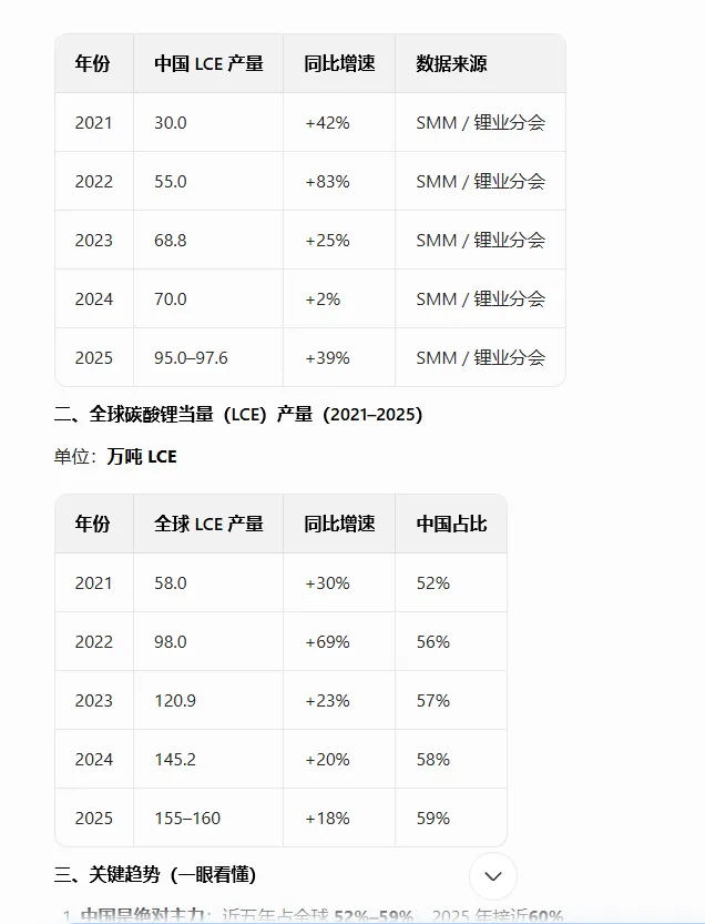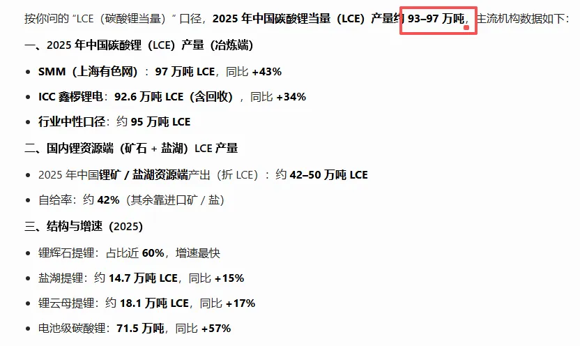 2025 年中国碳酸锂当量(LCE)产量约 93–97 万吨增长39%(2024年同比仅增长2%),占全球155-160万吨的59%左右。