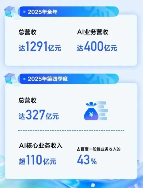 财报显示,百度2025年总营收达到1291亿元,其中AI业务表现尤为抢眼,营收高达400亿元。在第四季度,AI业务收入更是占到了百度一般性业务收入的43%,成为推动公司营收增长的重要引擎。