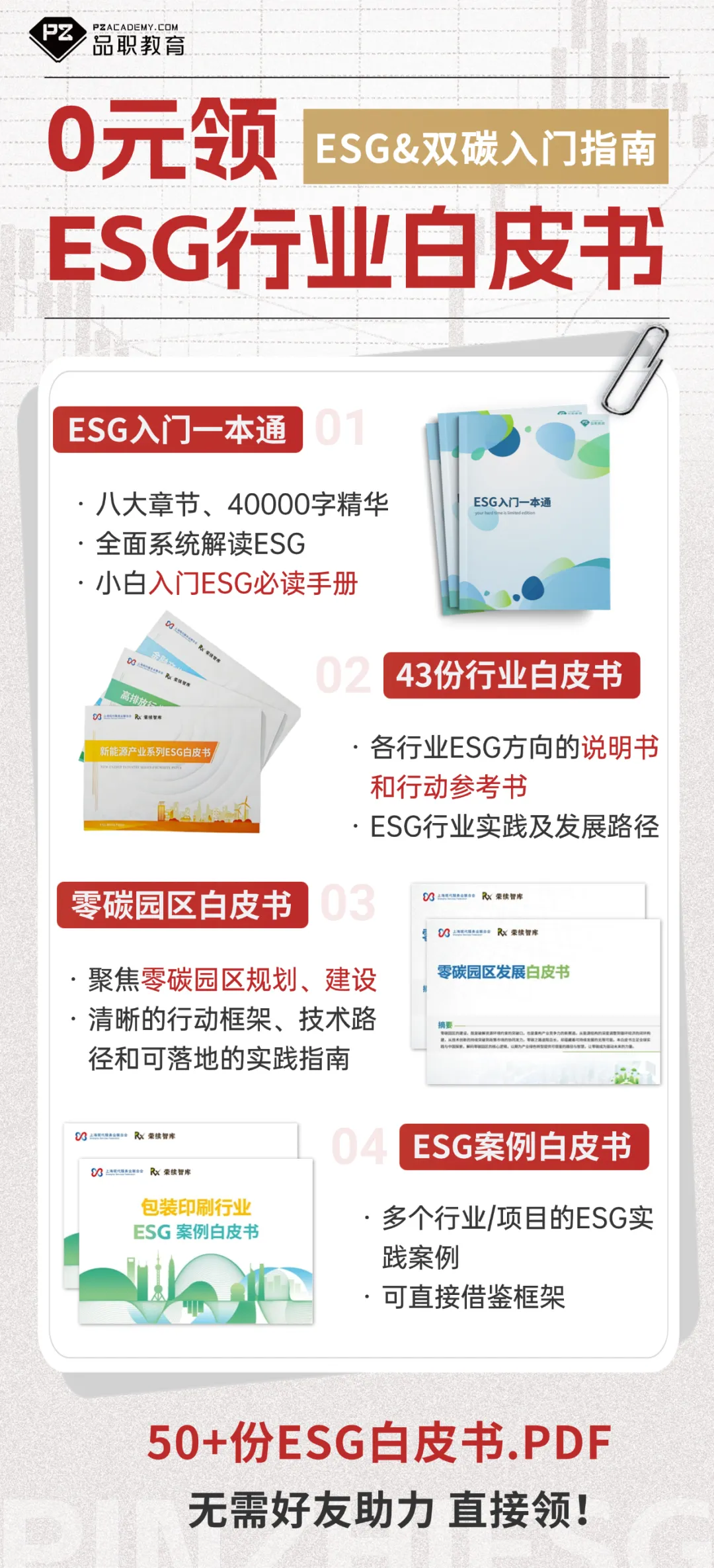 整体包含4大核心板块:《ESG入门一本通》+《43份行业白皮书》+《零碳园区白皮书》+《ESG案例白皮书》,从理论到实践,从政策到案例,从通用到细分,一站式补齐你的ESG资料缺口,不用再东拼西凑。