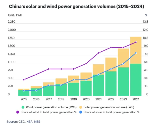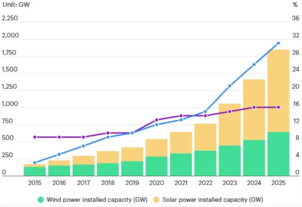 风光发电已实现跨越式增长。2024年风光总装机(1,407GW)首次超过煤电,提前6年完成2030年目标。2025年风光装机占比已达约47%。