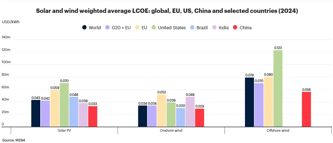 成本优势:中国风光发电的平准化度电成本全球领先,2024年光伏为0.033美元/千瓦时,陆上风电为0.029美元/千瓦时。