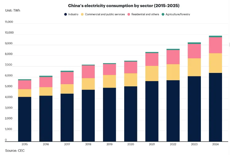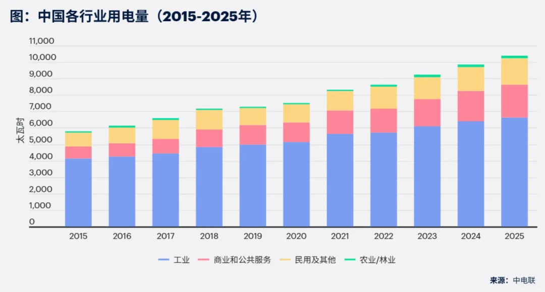 工业:仍是耗电主力(2024年占65%),但钢铁、水泥等高耗能行业电气化率(约16%)低于工业平均水平(27.7%)。高技术及装备制造业用电增速(10.3%)则显著高于制造业平均。