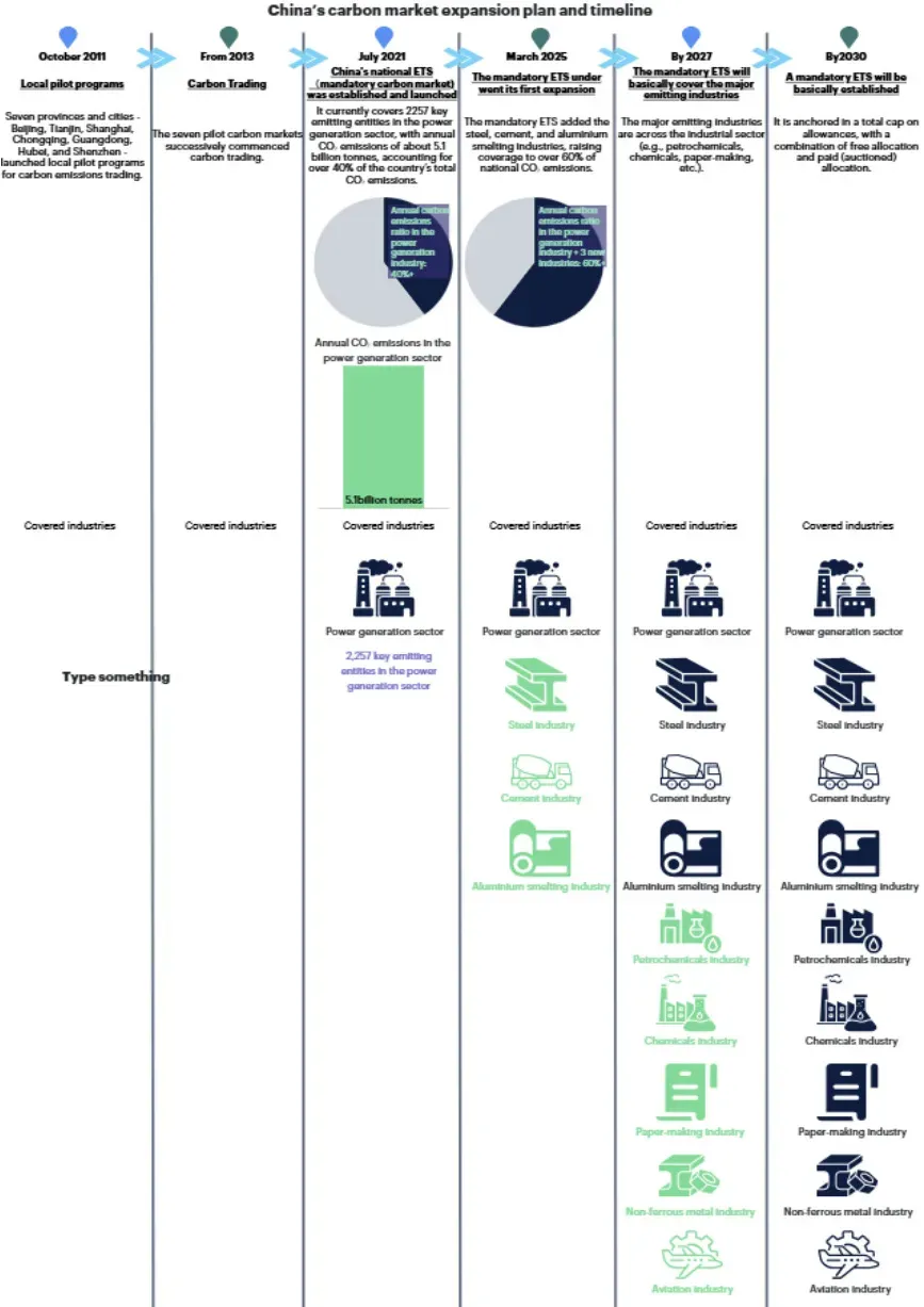 - 扩容:2025年3月首次扩容,纳入钢铁、水泥、电解铝行业,覆盖全国碳排放比例从40%提升至60%以上。