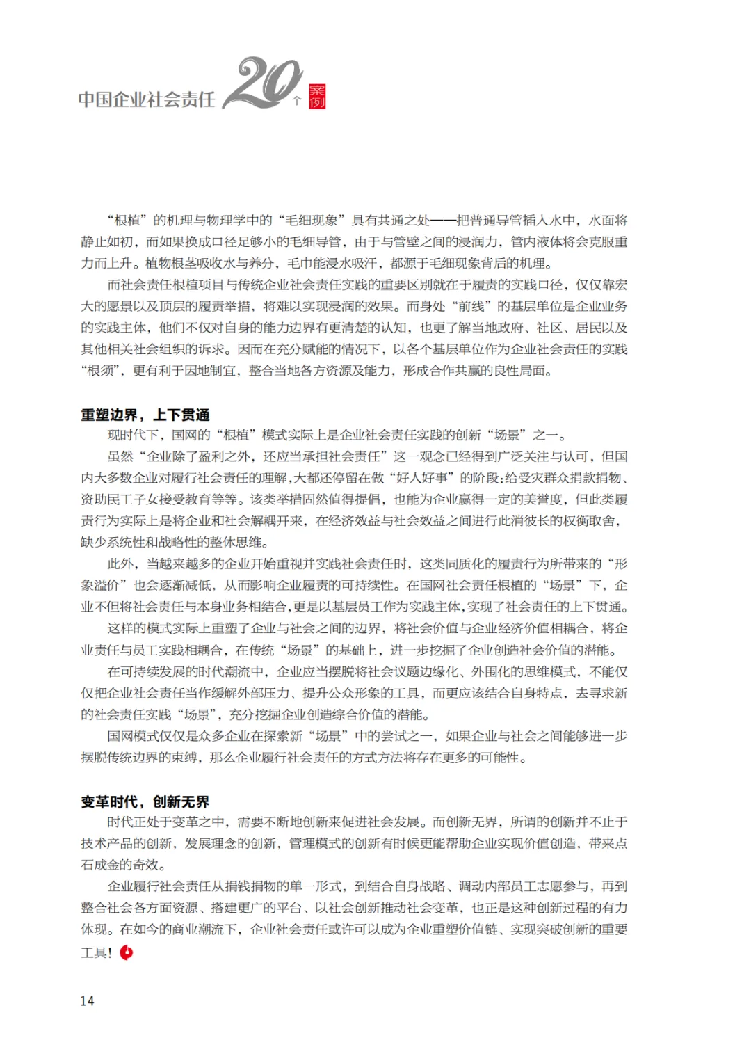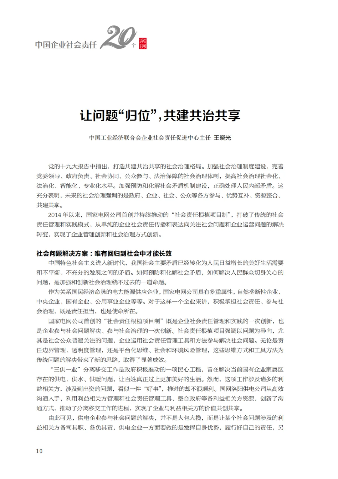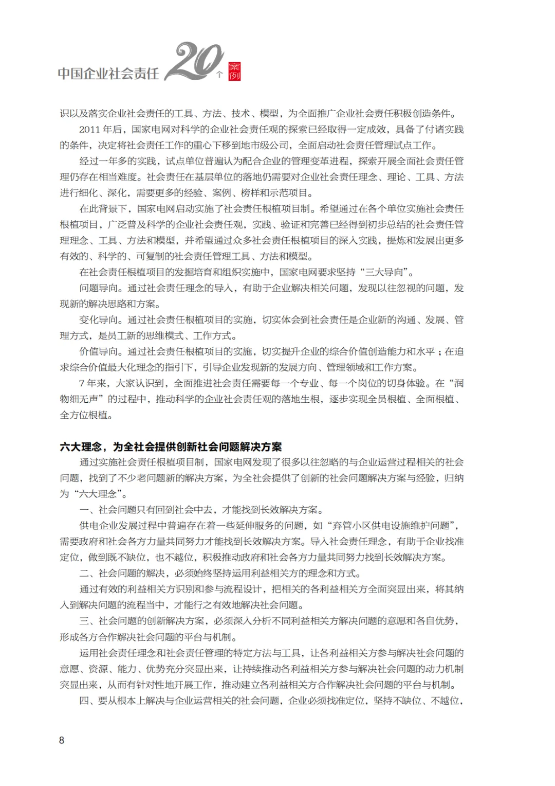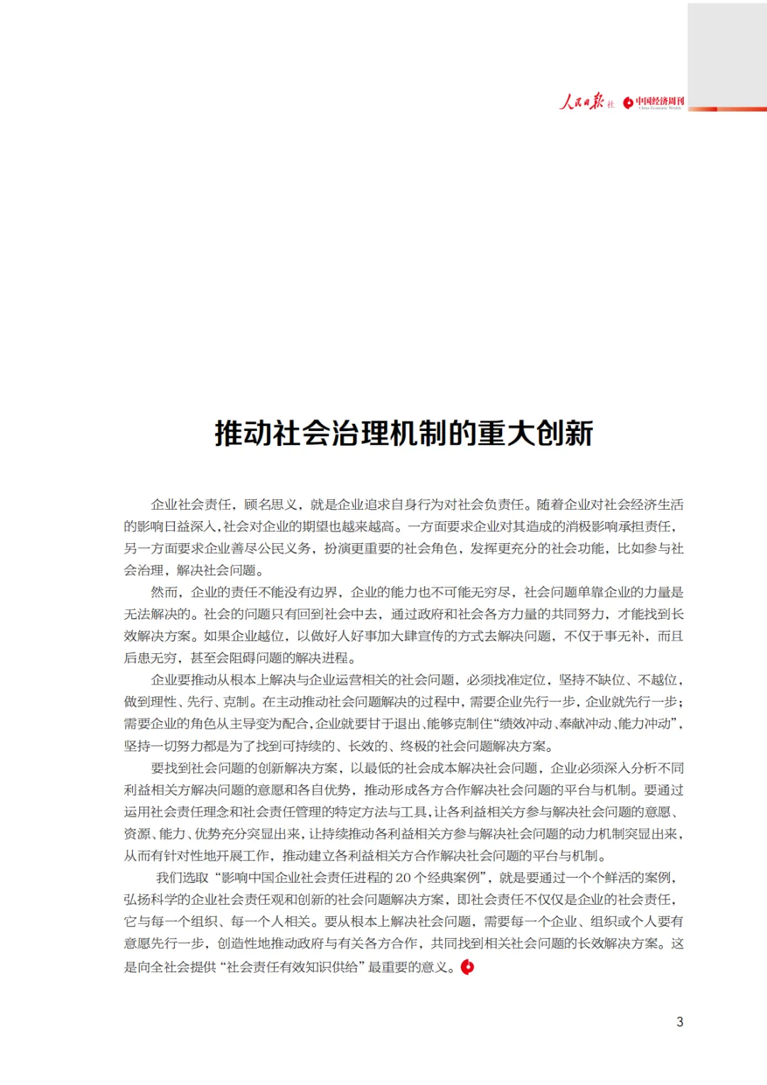 我们选取“影响中国企业社会责任进程的 20 个经典案例”,就是要通过一个个鲜活的案例,弘扬科学的企业社会责任观和创新的社会问题解决方案,即社会责任不仅仅是企业的社会责任,它与每一个组织、每一个人相关。要从根本上解决社会问题,需要每一个企业、组织或个人要有意愿先行一步,创造性地推动政府与有关各方合作,共同找到相关社会问题的长效解决方案。这是向全社会提供 “社会责任有效知识供给” 最重要的意义。