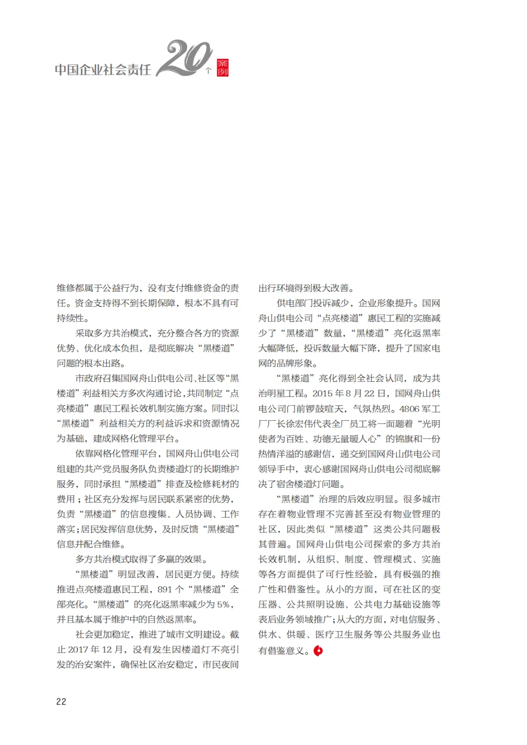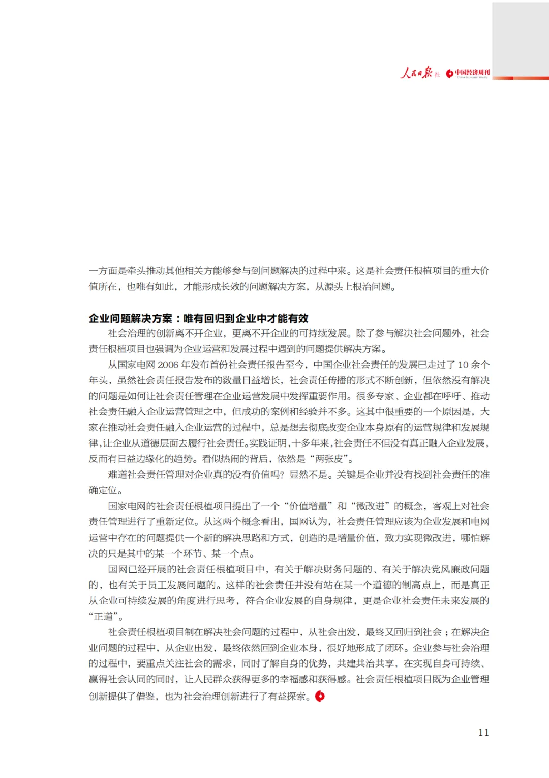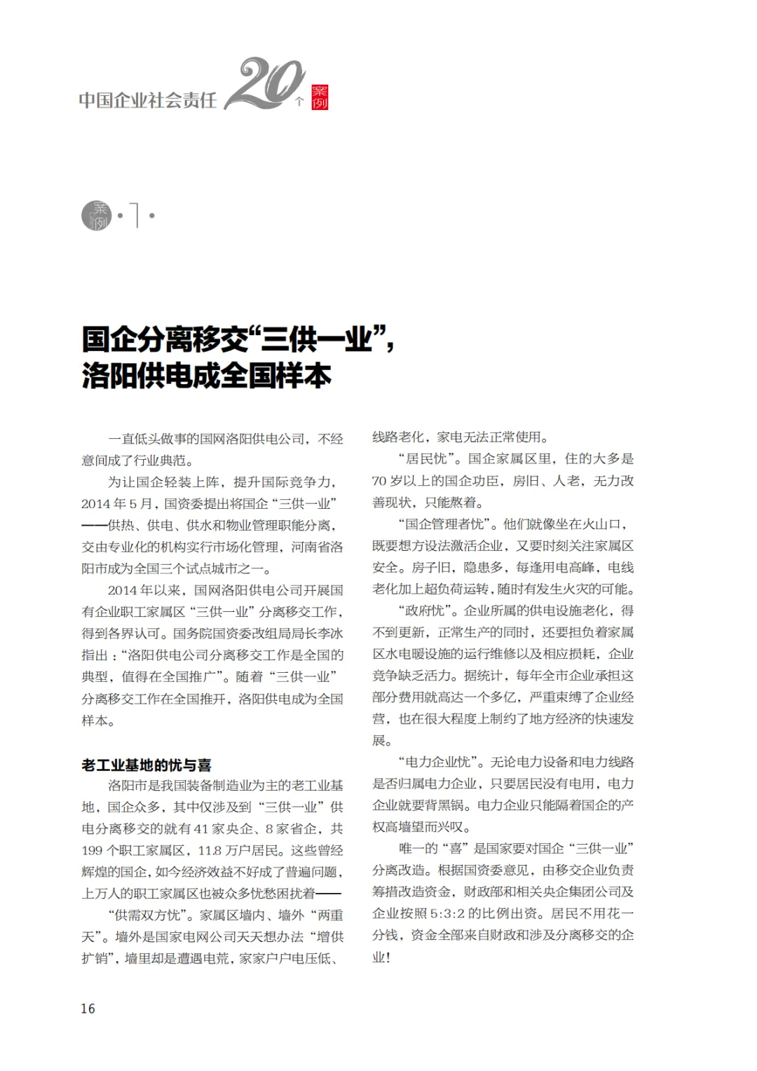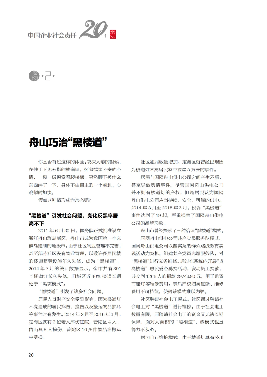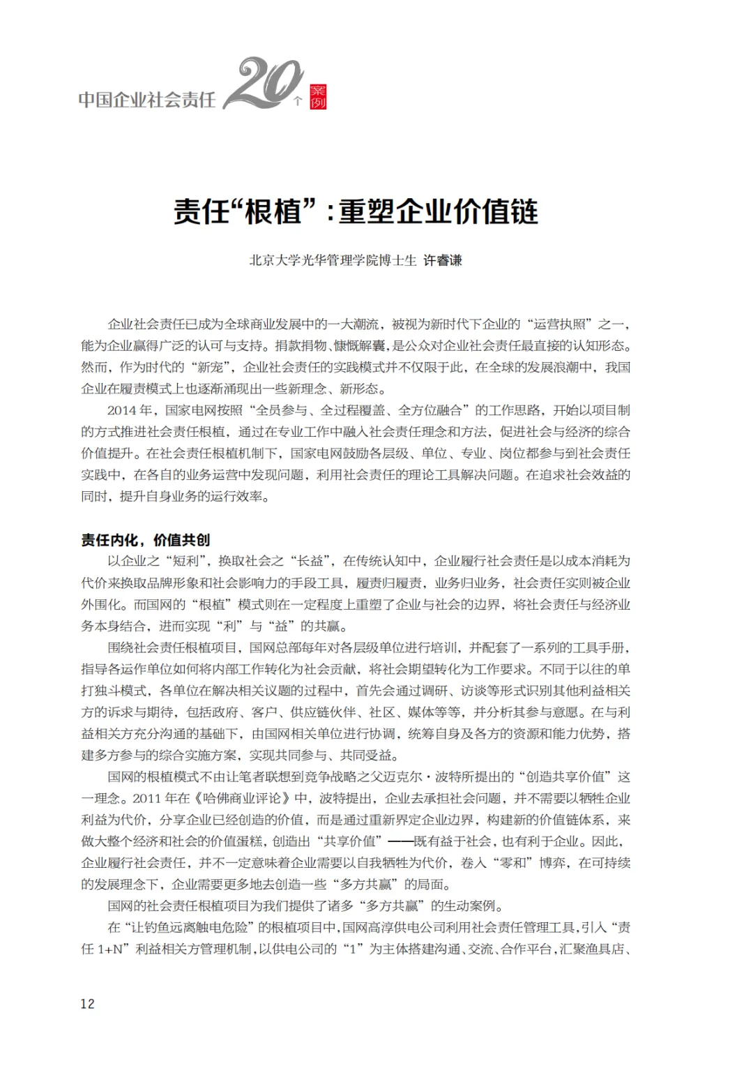 我们选取“影响中国企业社会责任进程的 20 个经典案例”,就是要通过一个个鲜活的案例,弘扬科学的企业社会责任观和创新的社会问题解决方案,即社会责任不仅仅是企业的社会责任,它与每一个组织、每一个人相关。要从根本上解决社会问题,需要每一个企业、组织或个人要有意愿先行一步,创造性地推动政府与有关各方合作,共同找到相关社会问题的长效解决方案。这是向全社会提供 “社会责任有效知识供给” 最重要的意义。