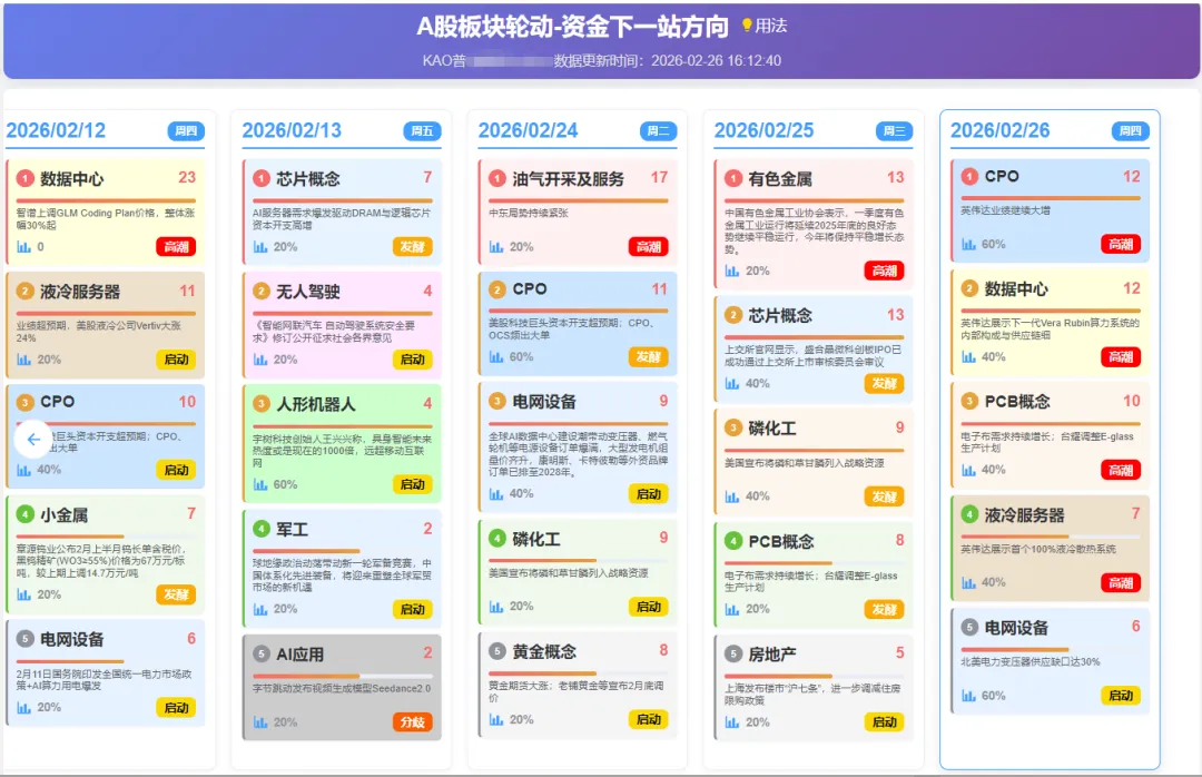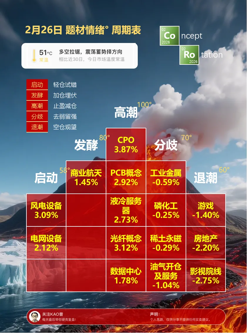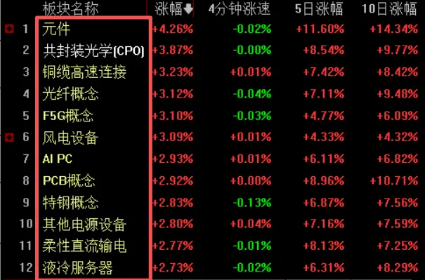 高潮阶段(止盈减仓) 板块及涨幅:CPO(3.87%)、PCB 概念(2.92%)、液冷服务器(2.73%)、光纤概念(3.12%)、数据中心(1.78%)