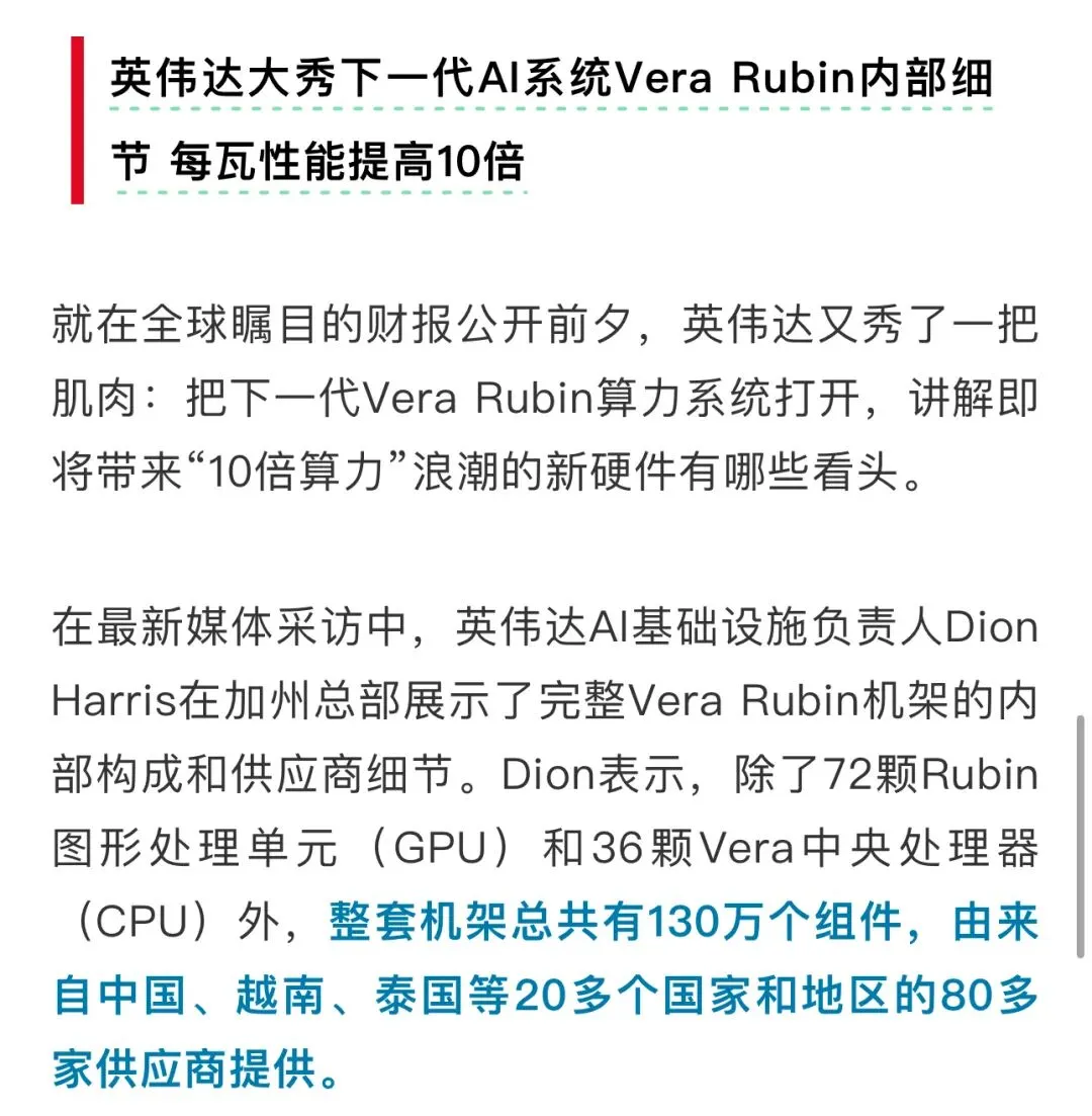 这波上涨离不开英伟达的催化,它就是AI硬件的“风向标”。昨日英伟达展示下一代Vera Rubin算力系统,一个机架就含72颗GPU、36颗CPU,共130万个组件,算力和能效比大幅提升,国内供应链企业直接受益。