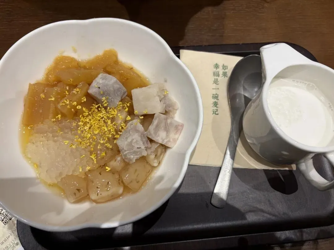 不只是咖啡,商场里的甜品店也迎来了新的更替。曾经守在商场中庭,可以说是「标配」的满记甜品,不少位置都替换成了麦记牛奶。我最早是在上海点外卖知道的这个品牌,没想到过去一年竟开了 800 多家店,到 2026 年 2 月全国门店数突破了一千家,可谓是餐饮里的中国速度了。