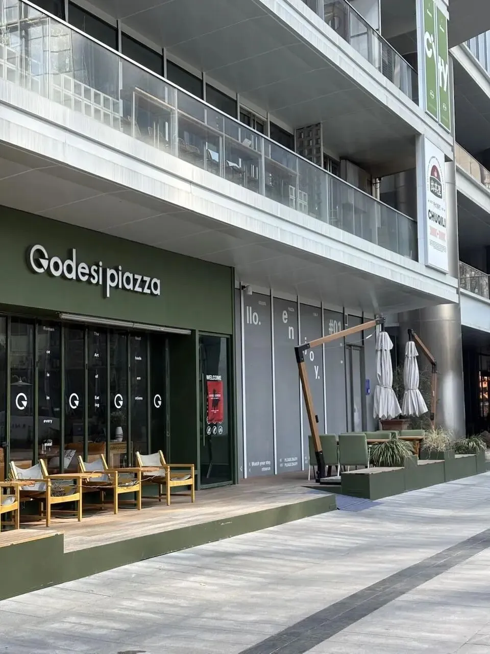 它的存在似乎不完全是孤例。临沂被当地人戏称为「小上海」,年轻人愿意停留的线下空间里常能看到些上海梧桐区的影子。而这些新线下空间的设计水准,大概都会向着在小红书「包出片的」靠拢。像水边开的这家 Godesi piazza 意餐店,就请了上海的灰空间建筑事务所做设计。